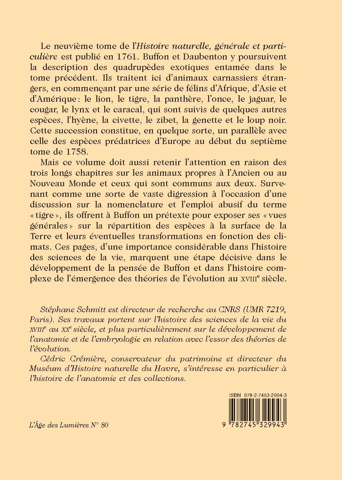 Le neuvième tome de l’Histoire naturelle, générale et particulière est publié en 1761. Buffon et Daubenton y poursuivent la description des quadrupèdes exotiques entamée dans le tome précédent. Ils traitent ici d’animaux carnassiers étrangers, en commençant par une série de félins d’Afrique, d’Asie et d’Amérique : le lion, le tigre, la panthère, l’once, le jaguar, le cougar, le lynx et le caracal, qui sont suivis de quelques autres espèces, l’hyène, la civette, le zibet, la genette et le loup noir. Cette succession constitue, en quelque sorte, un parallèle avec celle des espèces prédatrices d’Europe au début du septième tome de 1758.