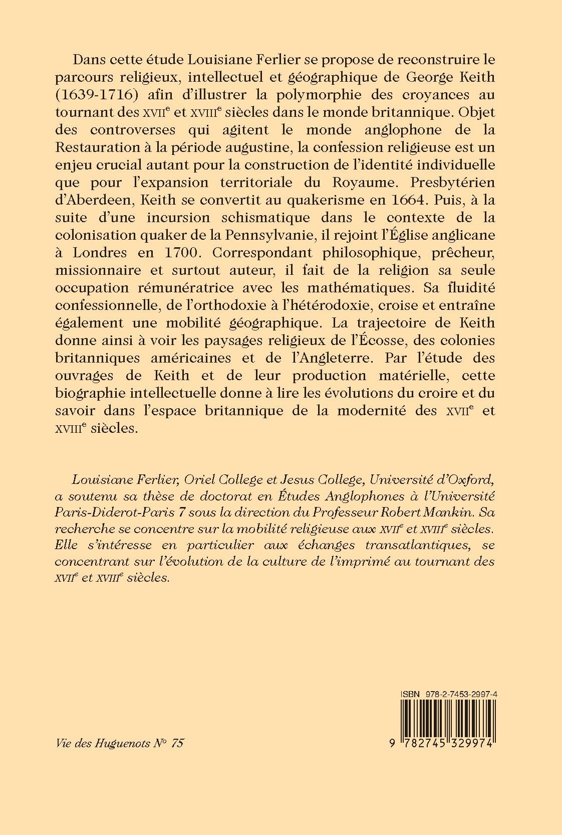 Dans cette étude Louisiane Ferlier se propose de reconstruire le parcours religieux, intellectuel et géographique de George Keith (1639-1716) afin d’illustrer la polymorphie des croyances au tournant des XVIIe et XVIIIe siècles dans le monde britannique. Objet des controverses qui agitent le monde anglophone de la Restauration à la période augustine, la confession religieuse est un enjeu crucial autant pour la construction de l’identité individuelle que pour l’expansion territoriale du Royaume. Presbytérien d’Aberdeen, Keith se convertit au quakerisme en 1664. Puis, à la suite d’une incursion schismatique dans le contexte de la colonisation quaker de la Pennsylvanie, il rejoint l’Église anglicane à Londres en 1700. Correspondant philosophique, prêcheur, missionnaire et surtout auteur, il fait de la religion sa seule occupation rémunératrice avec les mathématiques. Sa fluidité confessionnelle, de l’orthodoxie à l’hétérodoxie, croise et entraîne également une mobilité géographique. La trajectoire de Keith donne ainsi à voir les paysages religieux de l’Écosse, des colonies britanniques américaines et de l’Angleterre. Par l’étude des ouvrages de Keith et de leur production matérielle, cette biographie intellectuelle donne à lire les évolutions du croire et du savoir dans l’espace britannique de la modernité des XVIIe et XVIIIe siècles.