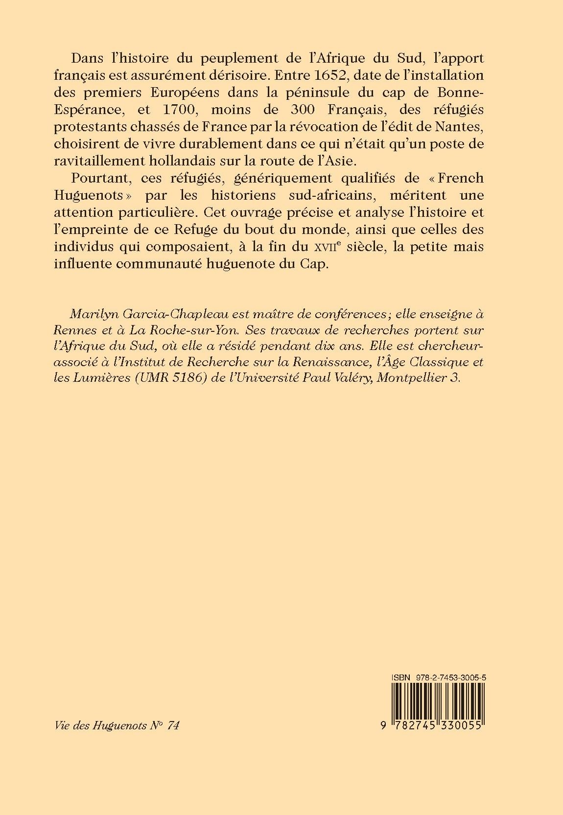 Pourtant, ces réfugiés, génériquement qualifiés de « French Huguenots » par les historiens sud-africains, méritent une attention particulière. Cet ouvrage précise et analyse l’histoire et l’empreinte de ce Refuge du bout du monde, ainsi que celles des individus qui composaient, à la fin du XVIIe siècle, la petite mais influente communauté huguenote du Cap.