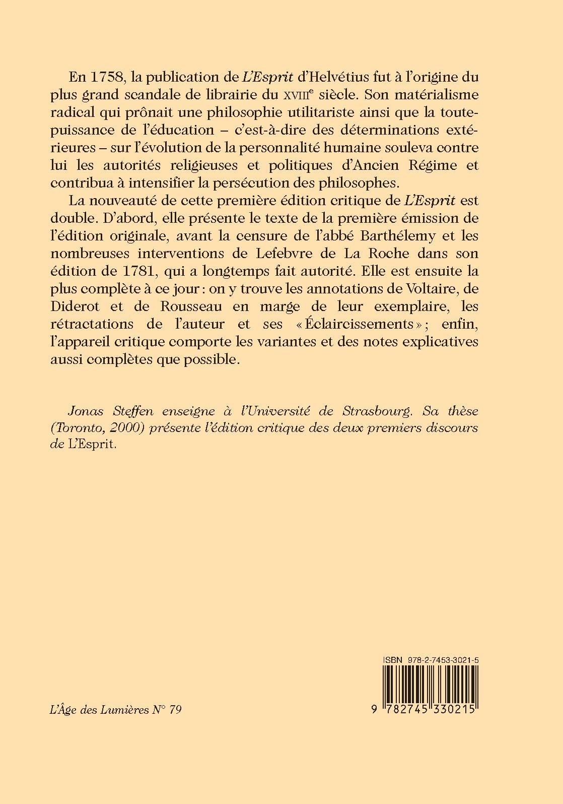 La nouveauté de cette première édition critique de L’Esprit est double. D’abord, elle présente le texte de la première émission de l’édition originale, avant la censure de l’abbé Barthélemy et les nombreuses interventions de Lefebvre de La Roche dans son édition de 1781, qui a longtemps fait autorité. Elle est ensuite la plus complète à ce jour: on y trouve les annotations de Voltaire, de Diderot et de Rousseau en marge de leur exemplaire, les rétractations de l’auteur et ses « Éclaircissements »; enfin, l’appareil critique comporte les variantes et des notes explicatives aussi complètes que possible.