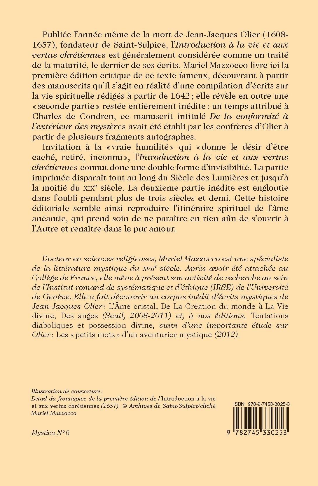 Publiée l’année même de la mort de Jean-Jacques Olier (1608- 1657), fondateur de Saint-Sulpice, l’Introduction à la vie et aux vertus chrétiennes est généralement considérée comme un traité de la maturité, le dernier de ses écrits. Mariel Mazzocco livre ici la première édition critique de ce texte fameux, découvrant à partir des manuscrits qu’il s’agit en réalité d’une compilation d’écrits sur la vie spirituelle rédigés à partir de 1642 ; elle révèle en outre une « seconde partie » restée entièrement inédite : un temps attribué à Charles de Condren, ce manuscrit intitulé De la conformité à l’extérieur des mystères avait été établi par les confrères d’Olier à partir de plusieurs fragments autographes. Invitation à la « vraie humilité » qui «donne le désir d’être caché, retiré, inconnu », l’Introduction à la vie et aux vertus chrétiennes connut donc une double forme d’invisibilité. La partie imprimée disparaît tout au long du Siècle des Lumières et jusqu’à la moitié du XIXe siècle. La deuxième partie inédite est engloutie dans l’oubli pendant plus de trois siècles et demi. Cette histoire éditoriale semble ainsi reproduire l’itinéraire spirituel de l’âme anéantie, qui prend soin de ne paraître en rien afin de s’ouvrir à l’Autre et renaître dans le pur amour.