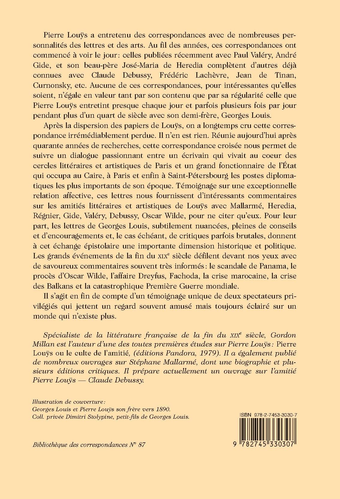 le jour: celles publiées récemment avec Paul Valéry, André Gide, et son beau-père José-Maria de Heredia complètent d’autres déjà connues avec Claude Debussy, Frédéric Lachèvre, Jean de Tinan, Curnonsky, etc. Aucune de ces correspondances, pour intéressantes qu’elles soient, n’égale en valeur tant par son contenu que par sa régularité celle que Pierre Louÿs entretint presque chaque jour et parfois plusieurs fois par jour pendant plus d’un quart de siècle avec son demi-frère, Georges Louis. Après la dispersion des papiers de Louÿs, on a longtemps cru cette correspondance irrémédiablement perdue. Il n’en est rien. Réunie aujourd’hui après quarante années de recherches, cette