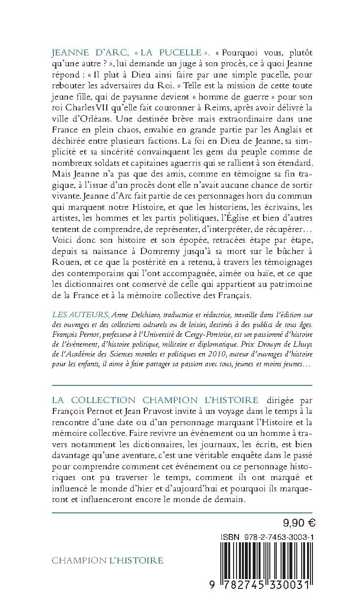 JEANNE D’ARC, « LA PUCELLE ». « Pourquoi vous, plutôt qu’une autre ? », lui demande un juge à son procès, ce à quoi Jeanne répond : « Il plut à Dieu ainsi faire par une simple pucelle, pour rebouter les adversaires du Roi. » Telle est la mission de cette toute jeune fille, qui de paysanne devient « homme de guerre » pour son roi Charles VII qu’elle fait couronner à Reims, après avoir délivré la ville d’Orléans. Une destinée brève mais extraordinaire dans une France en plein chaos, envahie en grande partie par les Anglais et déchirée entre plusieurs factions. La foi en Dieu de Jeanne, sa simplicité et sa sincérité convainquent les gens du peuple comme de nombreux soldats et capitaines aguerris qui se rallient à son étendard. Mais Jeanne n’a pas que des amis, comme en témoigne sa fin tragique, à l’issue d’un procès dont elle n’avait aucune chance de sortir vivante. Jeanne d’Arc fait partie de ces personnages hors du commun qui marquent notre Histoire, et que les historiens, les écrivains, les artistes, les hommes et les partis politiques, l’Église et bien d’autres tentent de comprendre, de représenter, d’interpréter, de récupérer… Voici donc son histoire et son épopée, retracées étape par étape, depuis sa naissance à Domremy jusqu’à sa mort sur le bûcher à Rouen, et ce que la postérité en a retenu, à travers les témoignages des contemporains qui l’ont accompagnée, aimée ou haïe, et ce que les dictionnaires ont conservé de celle qui appartient au patrimoine de la France et à la mémoire collective des Français.