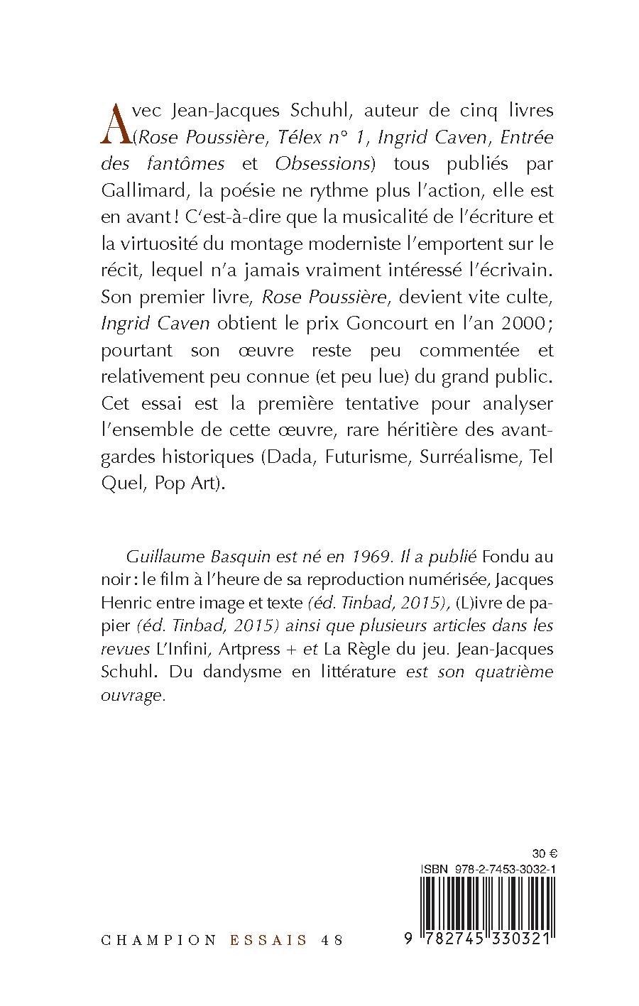 Avec Jean-Jacques Schuhl, auteur de cinq livres (Rose Poussière, Télex n° 1, Ingrid Caven, Entrée des fantômes et Obsessions) tous publiés par Gallimard, la poésie ne rythme plus l’action, elle est en avant ! C‘est-à-dire que la musicalité de l’écriture et la virtuosité du montage moderniste l’emportent sur le récit, lequel n’a jamais vraiment intéressé l’écrivain. Son premier livre, Rose Poussière, devient vite culte, Ingrid Caven obtient le prix Goncourt en l’an 2000 ; pourtant son oeuvre reste peu commentée et relativement peu connue (et peu lue) du grand public. Cet essai est la première tentative pour analyser l’ensemble de cette oeuvre, rare héritière des avantgardes historiques (Dada, Futurisme, Surréalisme, Tel Quel, Pop Art).