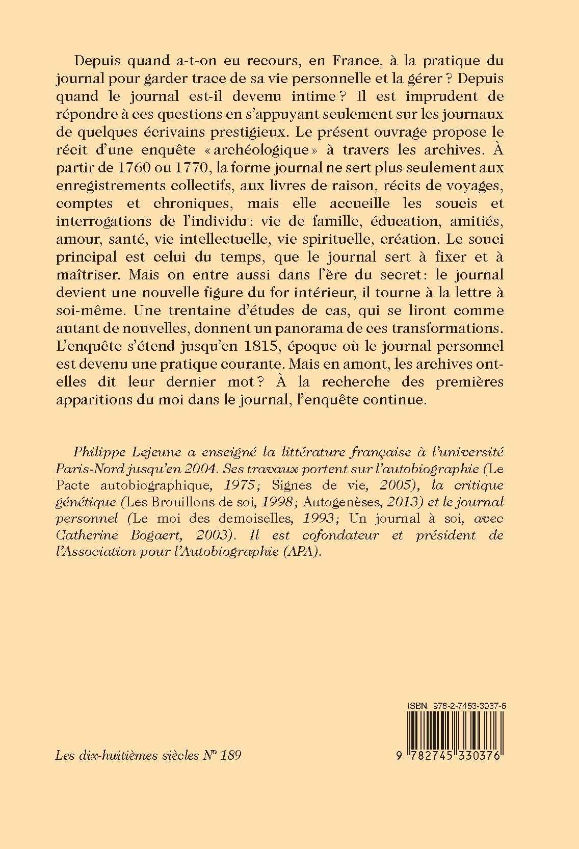 Depuis quand a-t-on eu recours, en France, à la pratique du journal pour garder trace de sa vie personnelle et la gérer? Depuis quand le journal est-il devenu intime? Il est imprudent de répondre à ces questions en s’appuyant seulement sur les journaux de quelques écrivains prestigieux. Le présent ouvrage propose le récit d’une enquête « archéologique » à travers les archives. À partir de 1760 ou 1770, la forme journal ne sert plus seulement aux enregistrements collectifs, aux livres de raison, récits de voyages, comptes et chroniques, mais elle accueille les soucis et interrogations de l’individu : vie de famille, éducation, amitiés, amour, santé, vie intellectuelle, vie spirituelle, création. Le souci principal est celui du temps, que le journal sert à fixer et à maîtriser. Mais on entre aussi dans l’ère du secret : le journal devient une nouvelle figure du for intérieur, il tourne à la lettre à soi-même. Une trentaine d’études de cas, qui se liront comme autant de nouvelles, donnent un panorama de ces transformations. L’enquête s’étend jusqu’en 1815, époque où le journal personnel est devenu une pratique courante. Mais en amont, les archives ont-elles dit leur dernier mot ? À la recherche des premières apparitions du moi dans le journal, l’enquête continue.