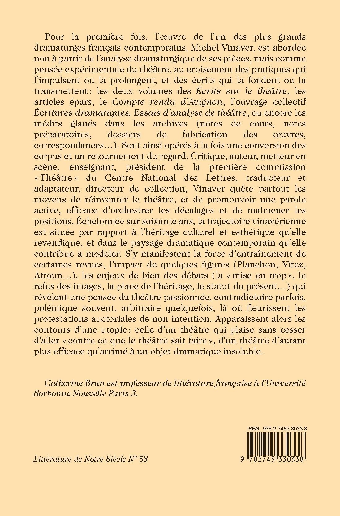 Pour la première fois, l’œuvre de l’un des plus grands dramaturges français contemporains, Michel Vinaver, est abordée non à partir de l’analyse dramaturgique de ses pièces, mais comme pensée expérimentale du théâtre, au croisement des pratiques qui l’impulsent ou la prolongent, et des écrits qui la fondent ou la transmettent : les deux volumes des Écrits sur le théâtre, les articles épars, le Compte rendu d’Avignon, l’ouvrage collectif Écritures dramatiques. Essais d’analyse de théâtre, ou encore les inédits glanés dans les archives (notes de cours, notes préparatoires, dossiers de fabrication des œuvres, correspondances…). Sont ainsi opérés à la fois une conversion des corpus et un retournement du regard. Critique, auteur, metteur en scène, enseignant, président de la première commission « Théâtre » du Centre National des Lettres, traducteur et adaptateur, directeur de collection, Vinaver quête partout les moyens de réinventer le théâtre, et de promouvoir une parole active, efficace d’orchestrer les décalages et de malmener les positions. Échelonnée sur soixante ans, la trajectoire vinavérienne est située par rapport à l’héritage culturel et esthétique qu’elle revendique, et dans le paysage dramatique contemporain qu’elle contribue à modeler. S’y manifestent la force d’entraînement de certaines revues, l’impact de quelques figures (Planchon, Vitez, Attoun…), les enjeux de bien des débats (la «mise en trop », le refus des images, la place de l’héritage, le statut du présent…) qui révèlent une pensée du théâtre passionnée, contradictoire parfois, polémique souvent, arbitraire quelquefois, là où fleurissent les protestations auctoriales de non intention. Apparaissent alors les contours d’une utopie : celle d’un théâtre qui plaise sans cesser d’aller « contre ce que le théâtre sait faire », d’un théâtre d’autant plus efficace qu’arrimé à un objet dramatique insoluble.