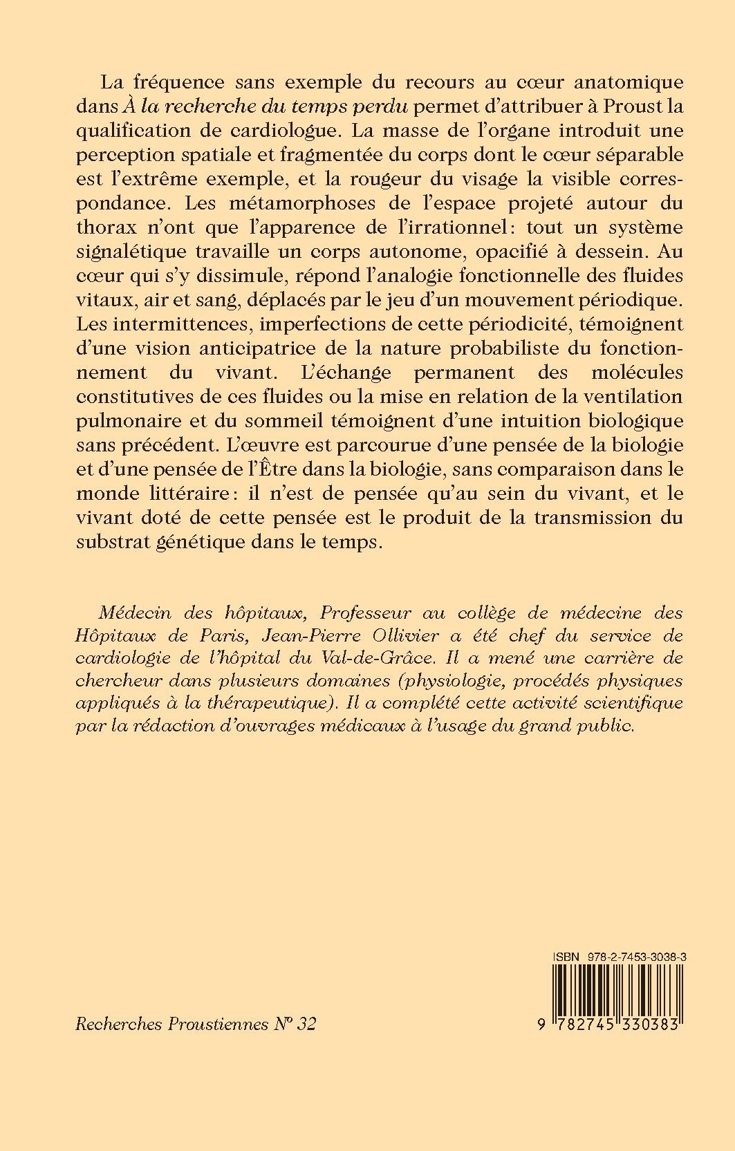 La fréquence sans exemple du recours au cœur anatomique dans À la recherche du temps perdu permet d’attribuer à Proust la qualification de cardiologue. La masse de l’organe introduit une perception spatiale et fragmentée du corps dont le cœur séparable est l’extrême exemple, et la rougeur du visage la visible correspondance. Les métamorphoses de l’espace projeté autour du thorax n’ont que l’apparence de l’irrationnel : tout un système signalétique travaille un corps autonome, opacifié à dessein. Au cœur qui s’y dissimule, répond l’analogie fonctionnelle des fluides vitaux, air et sang, déplacés par le jeu d’un mouvement périodique. Les intermittences, imperfections de cette périodicité, témoignent d’une vision anticipatrice de la nature probabiliste du fonctionnement du vivant. L’échange permanent des molécules constitutives de ces fluides ou la mise en relation de la ventilation pulmonaire et du sommeil témoignent d’une intuition biologique sans précédent. L’œuvre est parcourue d’une pensée de la biologie et d’une pensée de l’Être dans la biologie, sans comparaison dans le monde littéraire : il n’est de pensée qu’au sein du vivant, et le vivant doté de cette pensée est le produit de la transmission du substrat génétique dans le temps.