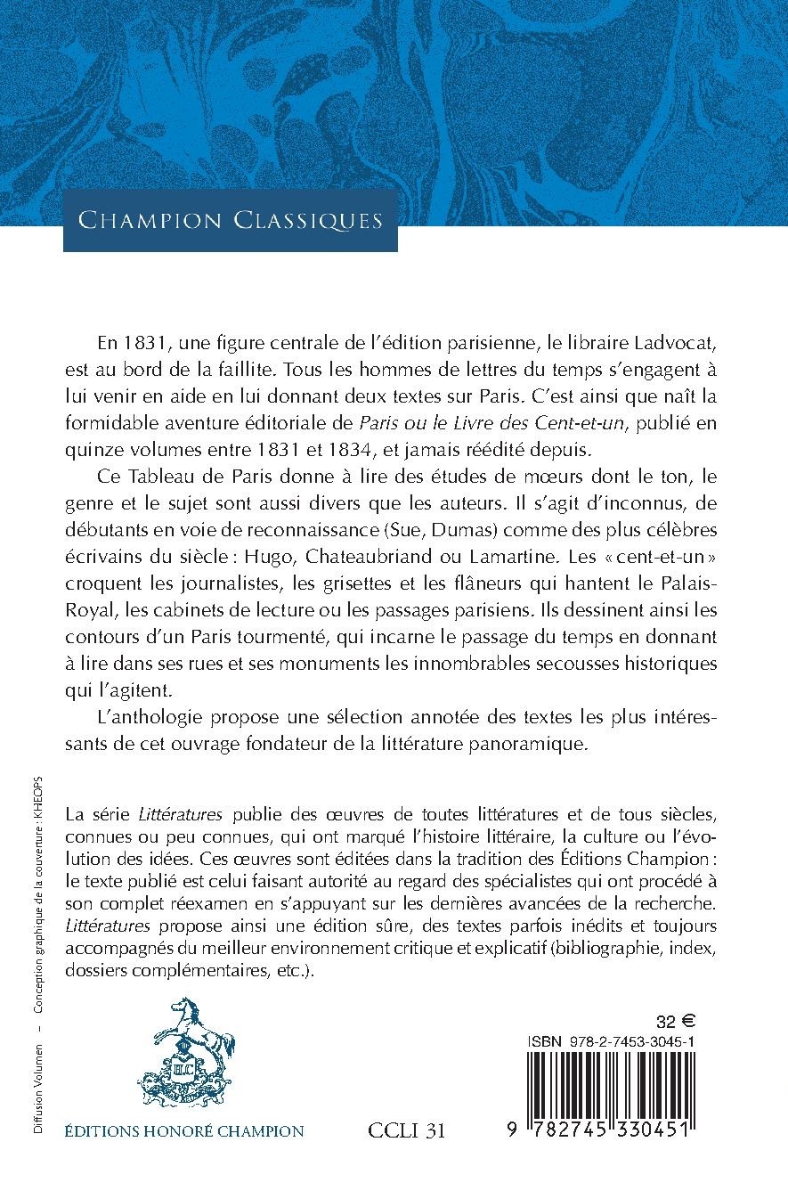 Ce Tableau de Paris donne à lire des études de mœurs dont le ton, le genre et le sujet sont aussi divers que les auteurs. Il s’agit d’inconnus, de débutants en voie de reconnaissance (Sue, Dumas) comme des plus célèbres écrivains du siècle : Hugo, Chateaubriand ou Lamartine. Les « cent-et-un » croquent les journalistes, les grisettes et les flâneurs qui hantent le Palais-Royal, les cabinets de lecture ou les passages parisiens. Ils dessinent ainsi les contours d’un Paris tourmenté, qui incarne le passage du temps en donnant à lire dans ses rues et ses monuments les innombrables secousses historiques qui l’agitent.