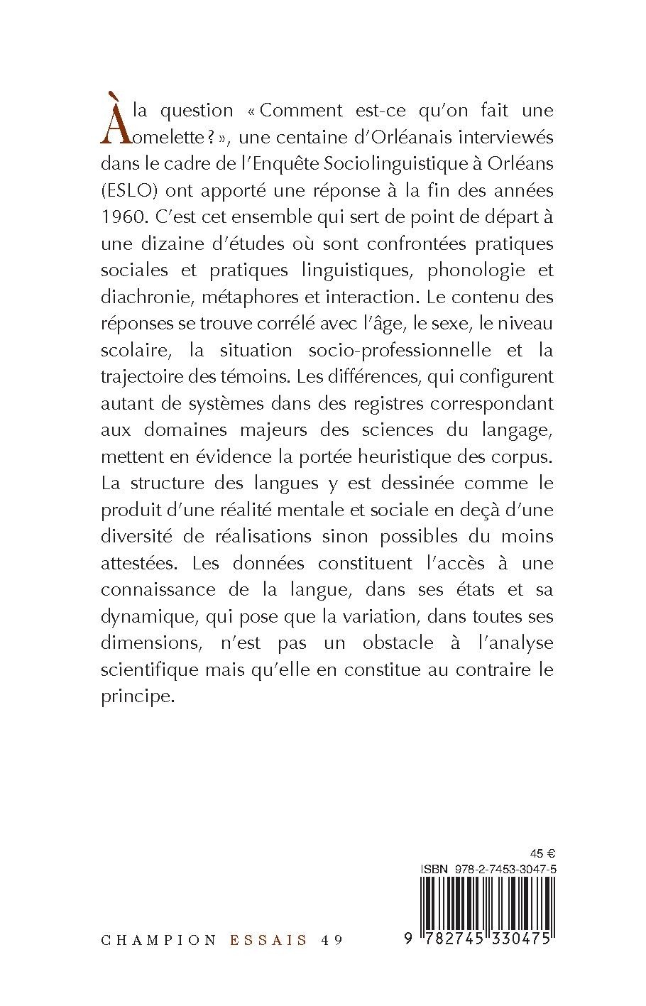 À la question « Comment est-ce qu’on fait une omelette ? », une centaine d’Orléanais interviewés dans le cadre de l’Enquête Sociolinguistique à Orléans (ESLO) ont apporté une réponse à la fin des années 1960. C’est cet ensemble qui sert de point de départ à une dizaine d’études où sont confrontées pratiques sociales et pratiques linguistiques, phonologie et diachronie, métaphores et interaction. Le contenu des réponses se trouve corrélé avec l’âge, le sexe, le niveau scolaire, la situation socio-professionnelle et la trajectoire des témoins. Les différences, qui configurent autant de systèmes dans des registres correspondant aux domaines majeurs des sciences du langage, mettent en évidence la portée heuristique des corpus. La structure des langues y est dessinée comme le produit d’une réalité mentale et sociale en deçà d’une diversité de réalisations sinon possibles du moins attestées. Les données constituent l’accès à une connaissance de la langue, dans ses états et sa dynamique, qui pose que la variation, dans toutes ses dimensions, n’est pas un obstacle à l’analyse scientifique mais qu’elle en constitue au contraire le principe.