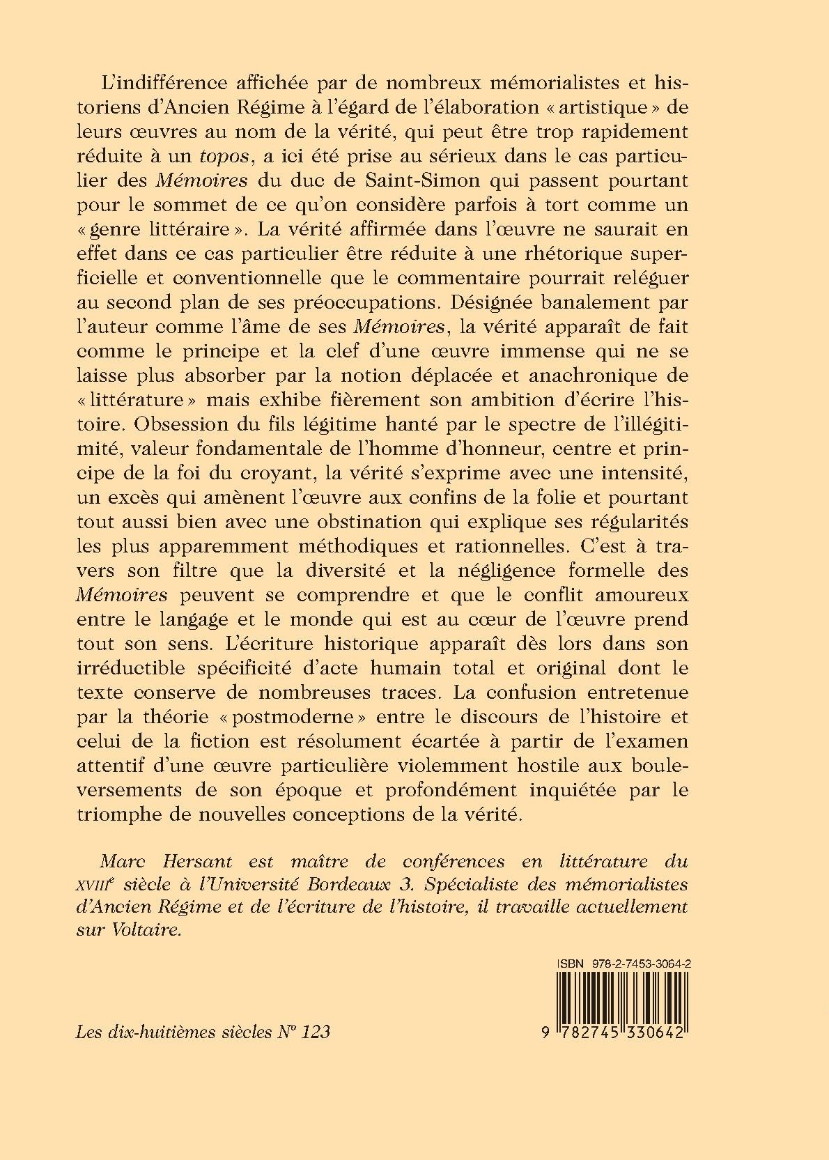 Marc Hersant est maître de conférences en littérature du XVIIIe siècle à l’Université Bordeaux 3. Spécialiste des mémorialistes d’Ancien Régime et de l’écriture de l’histoire, il travaille actuellement sur Voltaire.