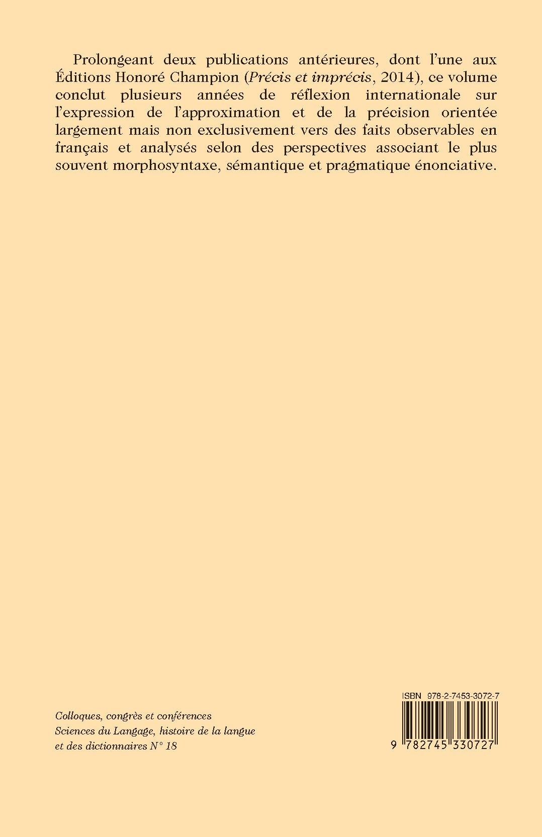 Prolongeant deux publications antérieures, dont l’une aux Éditions Honoré Champion (Précis et imprécis, 2014), ce volume conclut plusieurs années de réflexion internationale sur l’expression de l’approximation et de la précision orientée largement mais non exclusivement vers des faits observables en français et analysés selon des perspectives associant le plus souvent morphosyntaxe, sémantique et pragmatique énonciative.