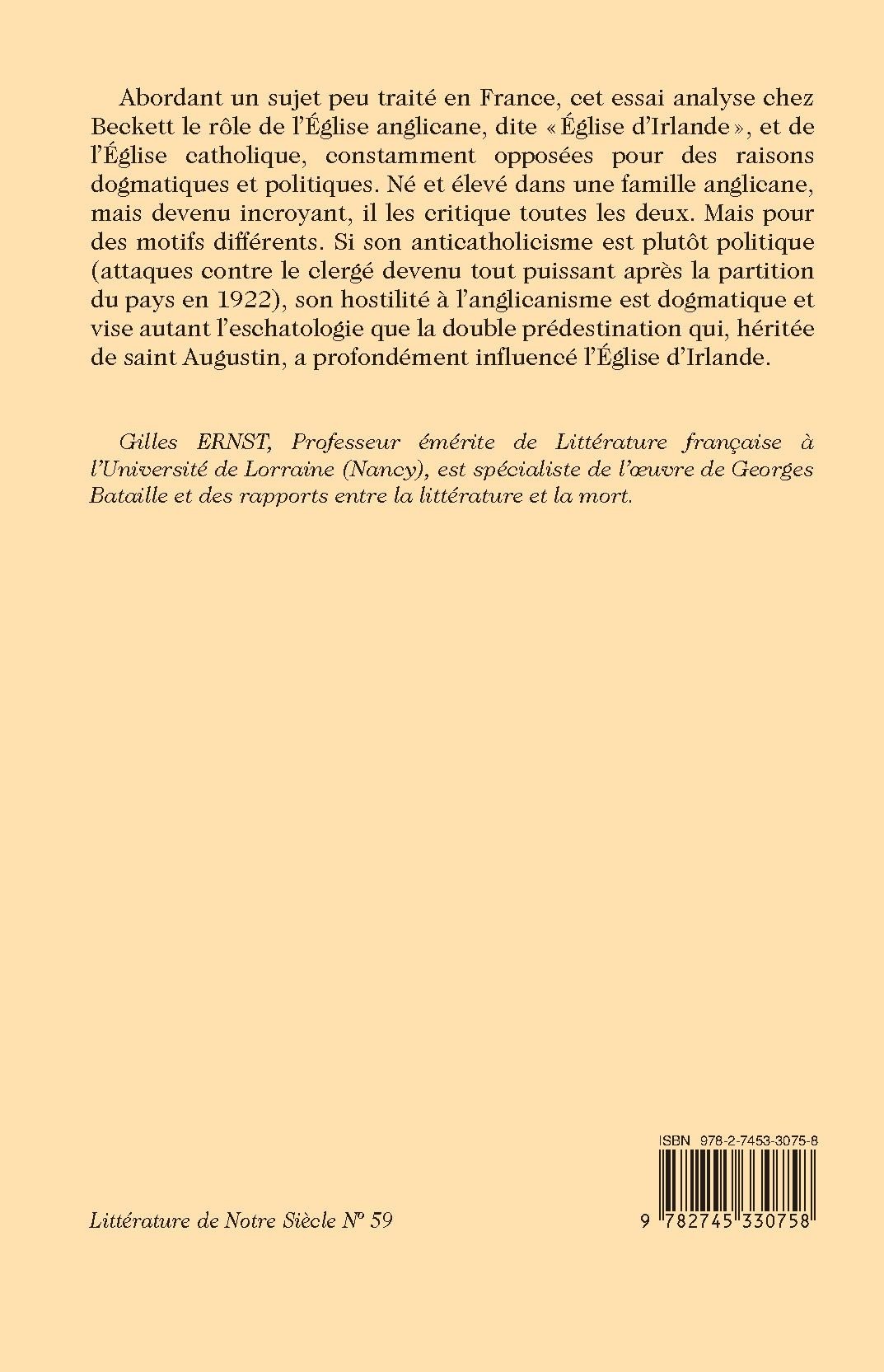 Abordant un sujet peu traité en France, cet essai analyse chez Beckett le rôle de l’Église anglicane, dite « Église d’Irlande », et de l’Église catholique, constamment opposées pour des raisons dogmatiques et politiques. Né et élevé dans une famille anglicane, mais devenu incroyant, il les critique toutes les deux. Mais pour des motifs différents. Si son anticatholicisme est plutôt politique (attaques contre le clergé devenu tout puissant après la partition du pays en 1922), son hostilité à l’anglicanisme est dogmatique et vise autant l’eschatologie que la double prédestination qui, héritée de saint Augustin, a profondément influencé l’Église d’Irlande.