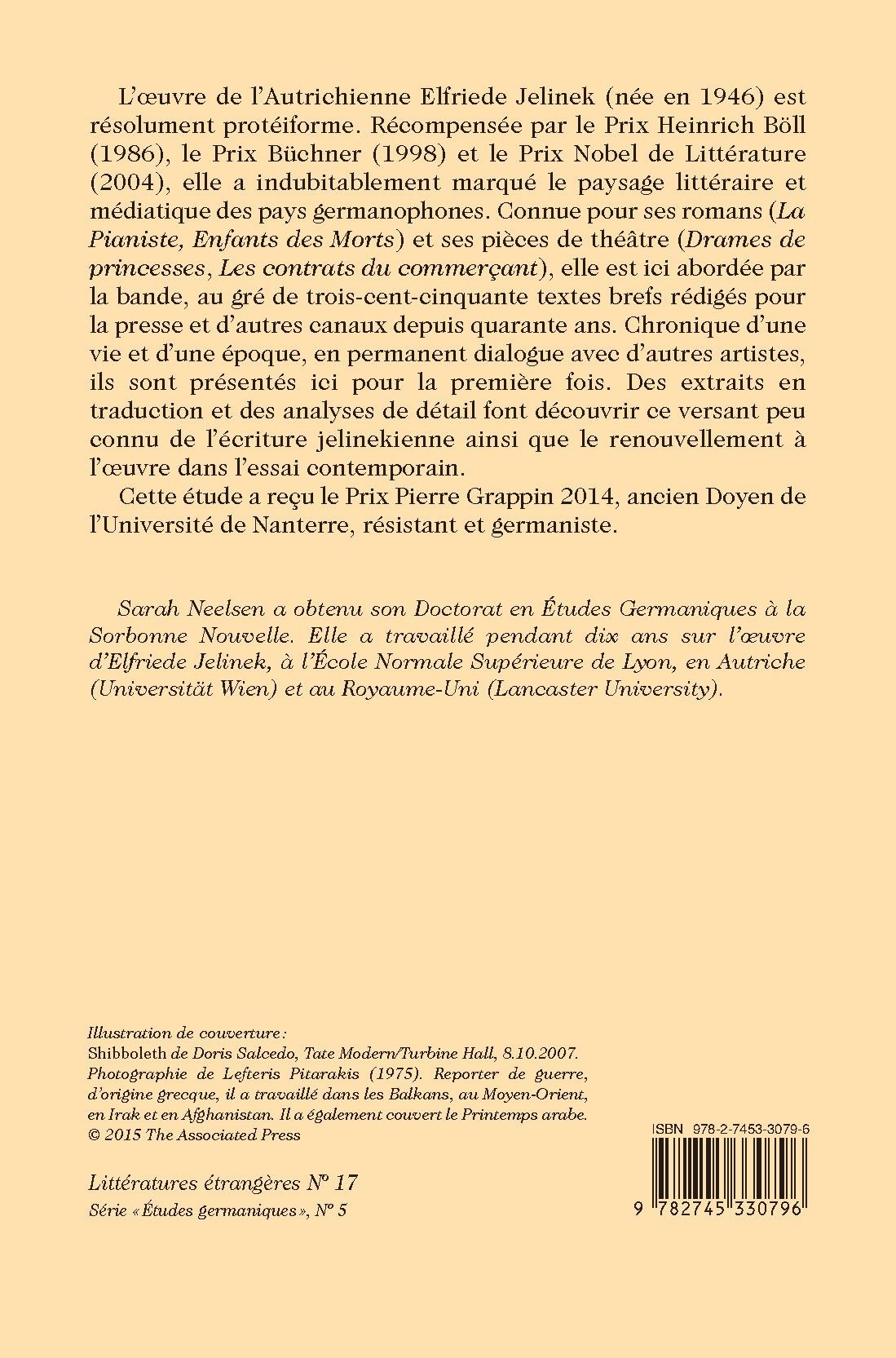 L’oeuvre de l’Autrichienne Elfriede Jelinek (née en 1946) est résolument protéiforme. Récompensée par le Prix Heinrich Böll (1986), le Prix Büchner (1998) et le Prix Nobel de Littérature (2004), elle a indubitablement marqué le paysage littéraire et médiatique des pays germanophones. Connue pour ses romans (La Pianiste, Enfants des Morts) et ses pièces de théâtre (Drames de princesses, Les contrats du commerçant), elle est ici abordée par la bande, au gré de trois-cent-cinquante textes brefs rédigés pour la presse et d’autres canaux depuis quarante ans. Chronique d’une vie et d’une époque, en permanent dialogue avec d’autres artistes, ils sont présentés ici pour la première fois. Des extraits en traduction et des analyses de détail font découvrir ce versant peu connu de l’écriture jelinekienne ainsi que le renouvellement à l’oeuvre dans l’essai contemporain.