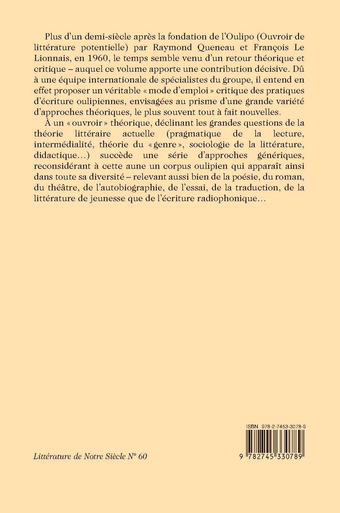 Plus d’un demi-siècle après la fondation de l’Oulipo (Ouvroir de littérature potentielle) par Raymond Queneau et François Le Lionnais, en 1960, le temps semble venu d’un retour théorique et critique – auquel ce volume apporte une contribution décisive. Dû à une équipe internationale de spécialistes du groupe, il entend en effet proposer un véritable «mode d’emploi » critique des pratiques d’écriture oulipiennes, envisagées au prisme d’une grande variété d’approches théoriques, le plus souvent tout à fait nouvelles.