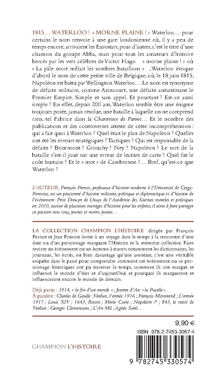 1815… WATERLOO ! « MORNE PLAINE ! » Waterloo… pour certains le nom renvoie à une gare londonienne où, il y a peu de temps encore, arrivaient les Eurostars, pour d’autres, c’est le titre d’une chanson du groupe Abba, mais pour tous les amateurs d’histoire bercés par les vers célèbres de Victor Hugo – « morne plaine ! » où « La pâle mort mêlait les sombres bataillons » –,Waterloo évoque d’abord le nom de cette petite ville de Belgique, où, le 18 juin 1815, Napoléon est battu par Wellington. Waterloo… Le nom est synonyme de défaite militaire, comme Azincourt, une défaite anéantissant le Premier Empire. Simple et sans appel. Et pourtant ? Est-ce aussi simple ? En effet, depuis 200 ans, Waterloo semble être une énigme toujours posée, jamais résolue, une bataille à laquelle on ne comprend rien, tel Fabrice dans la Chartreuse de Parme… Et le nombre des publications et des controverses atteste de cette incompréhension : qui a fait quoi à Waterloo ? Quel était le plan de Napoléon ? Quelles ont été les erreurs stratégiques ? Tactiques ? Qui est responsable de la défaite ? Bourmont ? Grouchy ? Ney ? Napoléon ? Le sort de la bataille s’est-il joué sur une erreur de lecture de carte ? Quel fut le coût humain ? Et le « mot » de Cambronne ?… Bref, qu’est-ce que Waterloo ?
