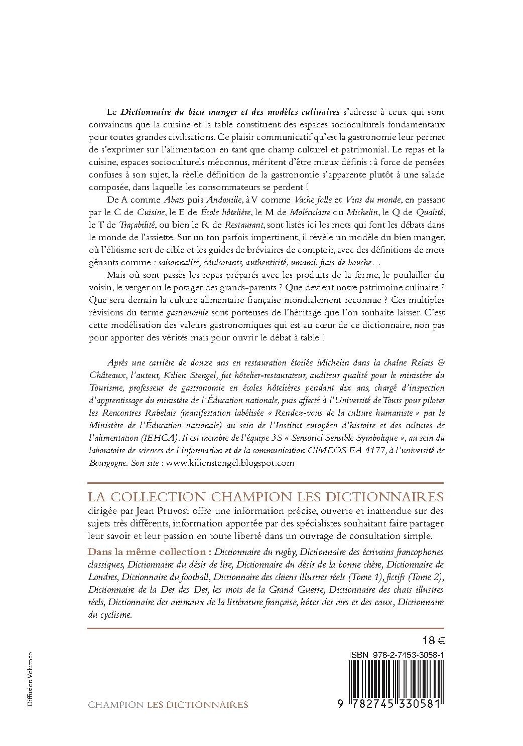 Après une carrière de douze ans en restauration étoilée Michelin dans la chaîne Relais & Châteaux, l’auteur, Kilien Stengel, fut hôtelier-restaurateur, auditeur qualité pour le ministère du Tourisme, professeur de gastronomie en écoles hôtelières pendant dix ans, chargé d’inspection d’apprentissage du ministère de l’Éducation nationale, puis affecté à l’Université de Tours pour piloter les Rencontres Rabelais (manifestation labélisée « Rendez-vous de la culture humaniste » par le Ministère de l’Éducation nationale) au sein de l’Institut européen d’histoire et des cultures de l’alimentation (IEHCA). Il est membre de l’équipe 3S « Sensoriel Sensible Symbolique », au sein du laboratoire de sciences de l’information et de la communication CIMEOS EA 4177, à l’université de Bourgogne. Son site : www.kilienstengel.blogspot.com