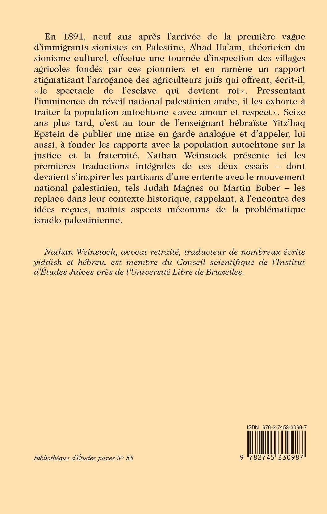 En 1891, neuf ans après l’arrivée de la première vague d’immigrants sionistes en Palestine, A’had Ha’am, théoricien du sionisme culturel, effectue une tournée d’inspection des villages agricoles fondés par ces pionniers et en ramène un rapport stigmatisant l’arrogance des agriculteurs juifs qui offrent, écrit-il, « le spectacle de l’esclave qui devient roi ». Pressentant l’imminence du réveil national palestinien arabe, il les exhorte à traiter la population autochtone « avec amour et respect ». Seize ans plus tard, c’est au tour de l’enseignant hébraïste Yitz’haq Epstein de publier une mise en garde analogue et d’appeler, lui aussi, à fonder les rapports avec la population autochtone sur la justice et la fraternité. Nathan Weinstock présente ici les premières traductions intégrales de ces deux essais – dont devaient s’inspirer les partisans d’une entente avec le mouvement national palestinien, tels Judah Magnes ou Martin Buber – les replace dans leur contexte historique, rappelant, à l’encontre des idées reçues, maints aspects méconnus de la problématique israélo-palestinienne.