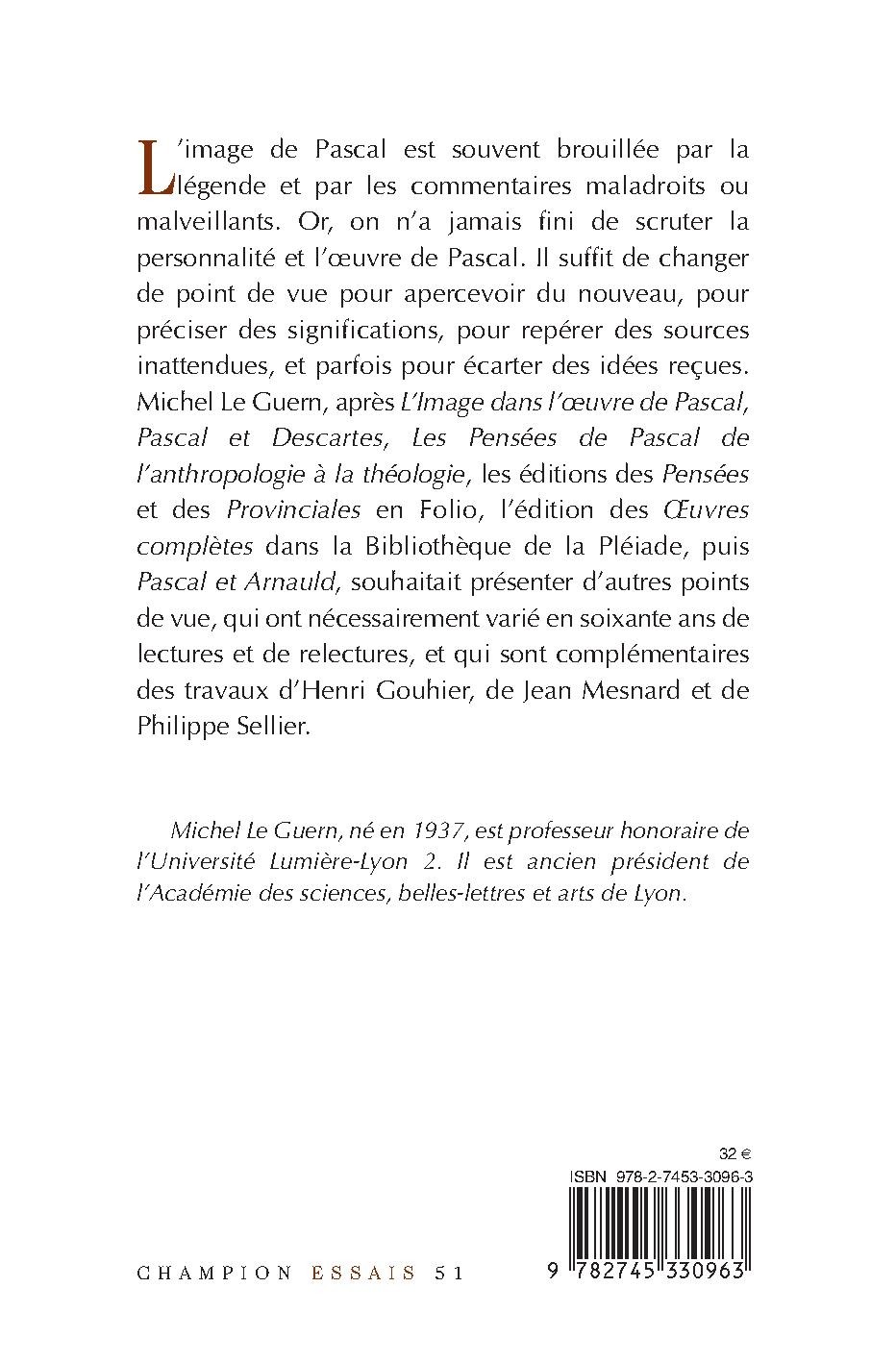 L’image de Pascal est souvent brouillée par la légende et par les commentaires maladroits ou malveillants. Or, on n’a jamais fini de scruter la personnalité et l’œuvre de Pascal. Il suffit de changer de point de vue pour apercevoir du nouveau, pour préciser des significations, pour repérer des sources inattendues, et parfois pour écarter des idées reçues. Michel Le Guern, après L’Image dans l’œuvre de Pascal, Pascal et Descartes, Les Pensées de Pascal de l’anthropologie à la théologie, les éditions des Pensées et des Provinciales en Folio, l’édition des Œuvres complètes dans la Bibliothèque de la Pléiade, puis Pascal et Arnauld, souhaitait présenter d’autres points de vue, qui ont nécessairement varié en soixante ans de lectures et de relectures, et qui sont complémentaires des travaux d’Henri Gouhier, de Jean Mesnard et de Philippe Sellier.