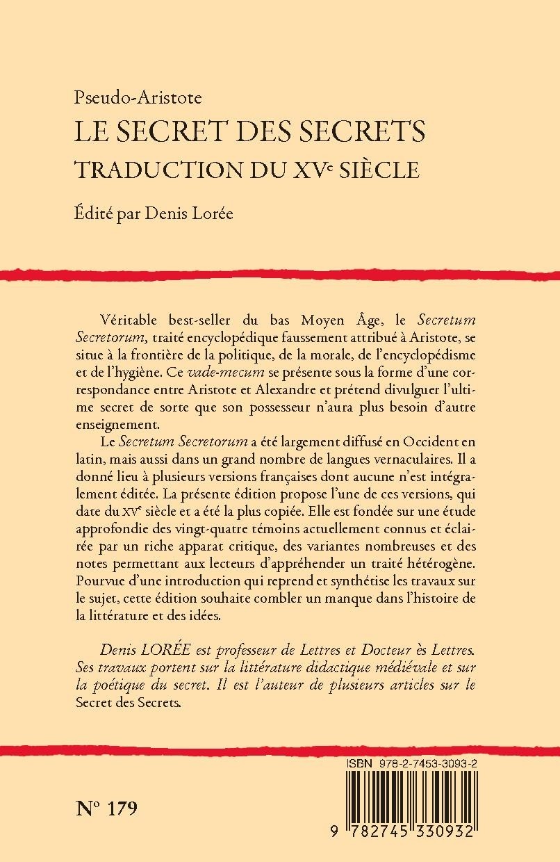Véritable best-seller du bas Moyen Âge, le Secretum Secretorum, traité encyclopédique faussement attribué à Aristote, se situe à la frontière de la politique, de la morale, de l’encyclopédisme et de l’hygiène. Ce vade-mecum se présente sous la forme d’une correspondance entre Aristote et Alexandre et prétend divulguer l’ultime secret de sorte que son possesseur n’aura plus besoin d’autre enseignement. Le Secretum Secretorum a été largement diffusé en Occident en latin, mais aussi dans un grand nombre de langues vernaculaires. Il a donné lieu à plusieurs versions françaises dont aucune n’est intégralement éditée. La présente édition propose l’une de ces versions, qui date du XVe siècle et a été la plus copiée. Elle est fondée sur une étude approfondie des vingt-quatre témoins actuellement connus et éclairée par un riche apparat critique, des variantes nombreuses et des notes permettant aux lecteurs d’appréhender un traité hétérogène. Pourvue d’une introduction qui reprend et synthétise les travaux sur le sujet, cette édition souhaite combler un manque dans l’histoire de la littérature et des idées.
