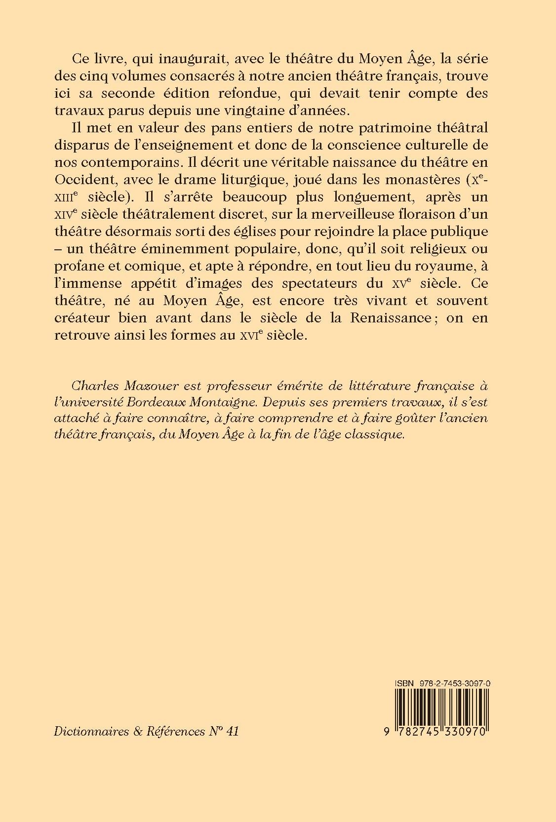 Il met en valeur des pans entiers de notre patrimoine théâtral disparus de l’enseignement et donc de la conscience culturelle de nos contemporains. Il décrit une véritable naissance du théâtre en Occident, avec le drame liturgique, joué dans les monastères (Xe- XIIIe siècle). Il s’arrête beaucoup plus longuement, après un XIVe siècle théâtralement discret, sur la merveilleuse floraison d’un théâtre désormais sorti des églises pour rejoindre la place publique – un théâtre éminemment populaire, donc, qu’il soit religieux ou profane et comique, et apte à répondre, en tout lieu du royaume, à l’immense appétit d’images des spectateurs du XVe siècle. Ce théâtre, né au Moyen Âge, est encore très vivant et souvent créateur bien avant dans le siècle de la Renaissance ; on en retrouve ainsi les formes au XVIe siècle.