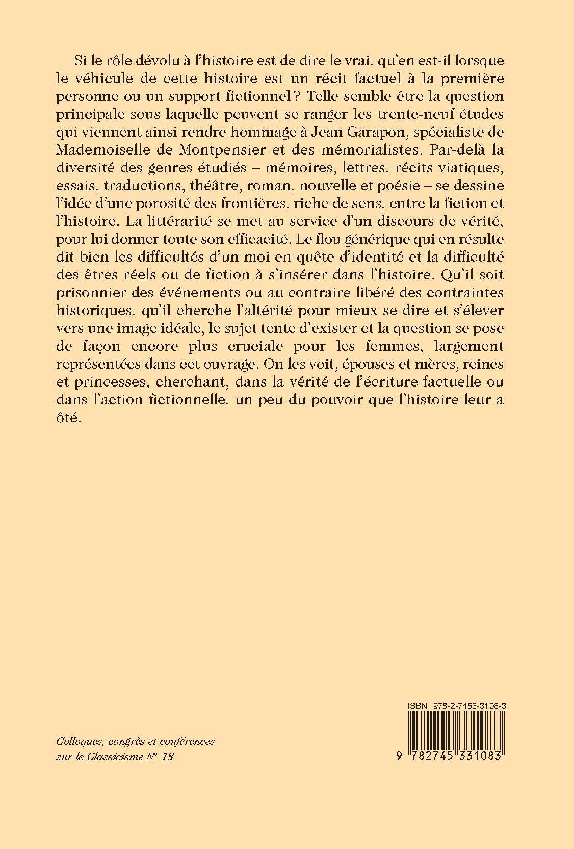 Si le rôle dévolu à l’histoire est de dire le vrai, qu’en est-il lorsque le véhicule de cette histoire est un récit factuel à la première personne ou un support fictionnel ? Telle semble être la question principale sous laquelle peuvent se ranger les trente-neuf études qui viennent ainsi rendre hommage à Jean Garapon, spécialiste de Mademoiselle de Montpensier et des mémorialistes. Par-delà la diversité des genres étudiés – mémoires, lettres, récits viatiques, essais, traductions, théâtre, roman, nouvelle et poésie – se dessine l’idée d’une porosité des frontières, riche de sens, entre la fiction et l’histoire. La littérarité se met au service d’un discours de vérité, pour lui donner toute son efficacité. Le flou générique qui en résulte dit bien les difficultés d’un moi en quête d’identité et la difficulté des êtres réels ou de fiction à s’insérer dans l’histoire. Qu’il soit prisonnier des événements ou au contraire libéré des contraintes historiques, qu’il cherche l’altérité pour mieux se dire et s’élever vers une image idéale, le sujet tente d’exister et la question se pose de façon encore plus cruciale pour les femmes, largement représentées dans cet ouvrage. On les voit, épouses et mères, reines et princesses, cherchant, dans la vérité de l’écriture factuelle ou dans l’action fictionnelle, un peu du pouvoir que l’histoire leur a ôté.