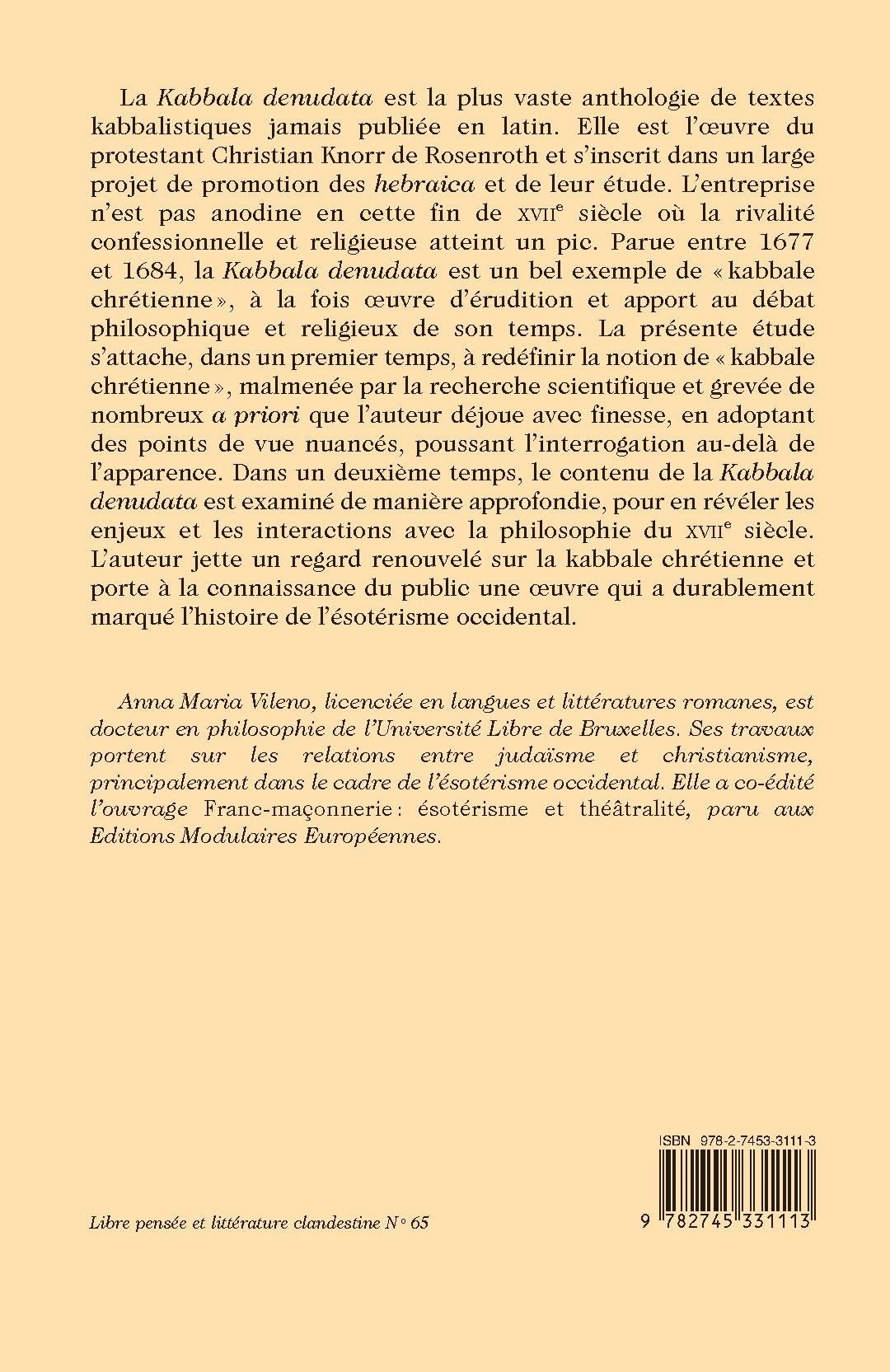 La Kabbala denudata est la plus vaste anthologie de textes kabbalistiques jamais publiée en latin. Elle est l’oeuvre du protestant Christian Knorr de Rosenroth et s’inscrit dans un large projet de promotion des hebraica et de leur étude. L’entreprise n’est pas anodine en cette fin de XVIIe siècle où la rivalité confessionnelle et religieuse atteint un pic. Parue entre 1677 et 1684, la Kabbala denudata est un bel exemple de « kabbale chrétienne », à la fois oeuvre d’érudition et apport au débat philosophique et religieux de son temps. La présente étude s’attache, dans un premier temps, à redéfinir la notion de « kabbale chrétienne », malmenée par la recherche scientifique et grevée de nombreux a priori que l’auteur déjoue avec finesse, en adoptant des points de vue nuancés, poussant l’interrogation au-delà de l’apparence. Dans un deuxième temps, le contenu de la Kabbala denudata est examiné de manière approfondie, pour en révéler les enjeux et les interactions avec la philosophie du XVIIe siècle. L’auteur jette un regard renouvelé sur la kabbale chrétienne et porte à la connaissance du public une oeuvre qui a durablement marqué l’histoire de l’ésotérisme occidental.