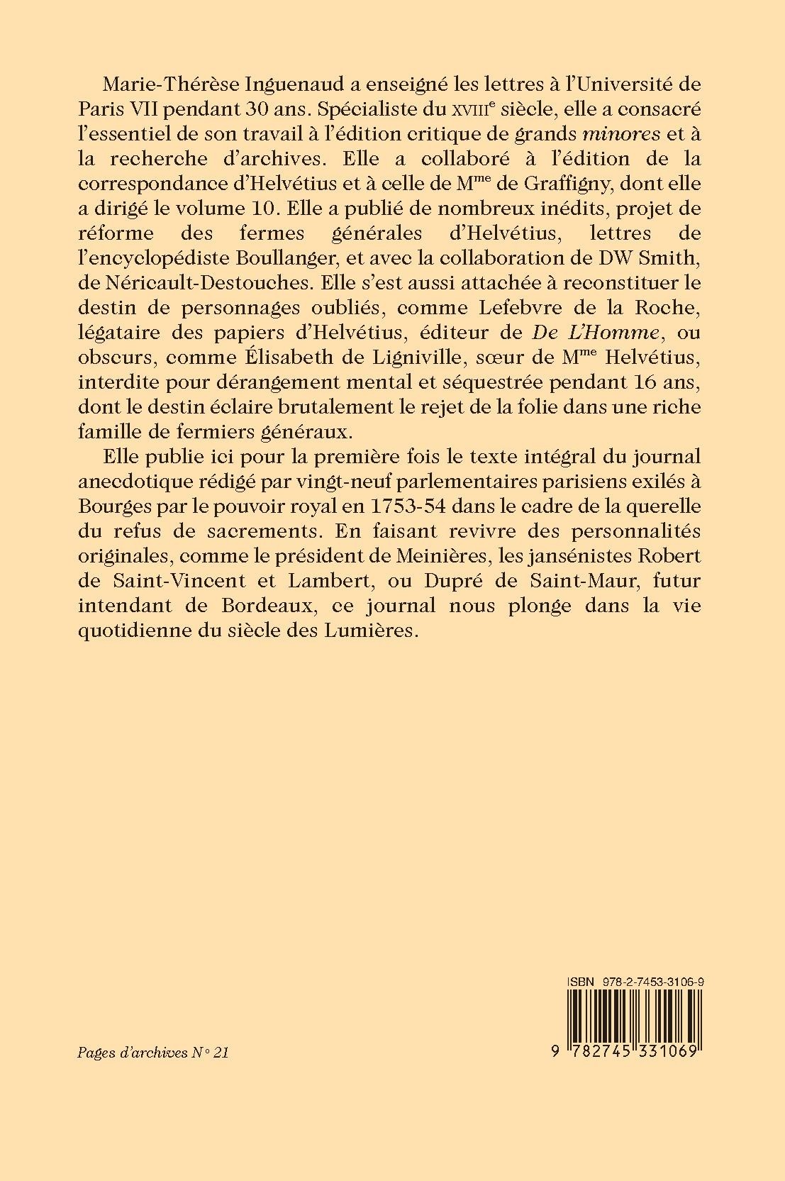 Elle publie ici pour la première fois le texte intégral du journal anecdotique rédigé par vingt-neuf parlementaires parisiens exilés à Bourges par le pouvoir royal en 1753-54 dans le cadre de la querelle du refus de sacrements. En faisant revivre des personnalités originales, comme le président de Meinières, les jansénistes Robert de Saint-Vincent et Lambert, ou Dupré de Saint-Maur, futur intendant de Bordeaux, ce journal nous plonge dans la vie quotidienne du siècle des Lumières.