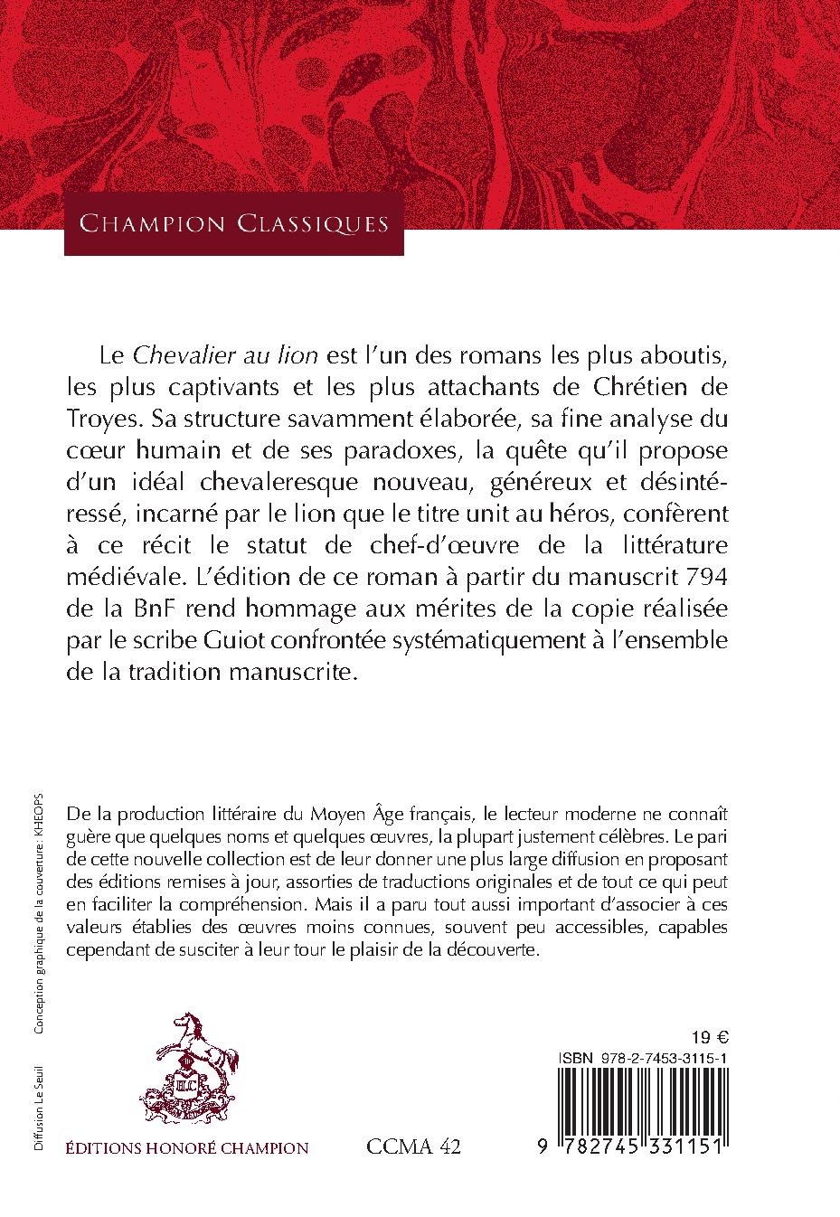 Le Chevalier au lion est l’un des romans les plus aboutis, les plus captivants et les plus attachants de Chrétien de Troyes. Sa structure savamment élaborée, sa fine analyse du cœur humain et de ses paradoxes, la quête qu’il propose d’un idéal chevaleresque nouveau, généreux et désintéressé, incarné par le lion que le titre unit au héros, confèrent à ce récit le statut de chef-d’œuvre de la littérature médiévale. L’édition de ce roman à partir du manuscrit 794 de la BnF rend hommage aux mérites de la copie réalisée par le scribe Guiot confrontée systématiquement à l’ensemble de la tradition manuscrite.
