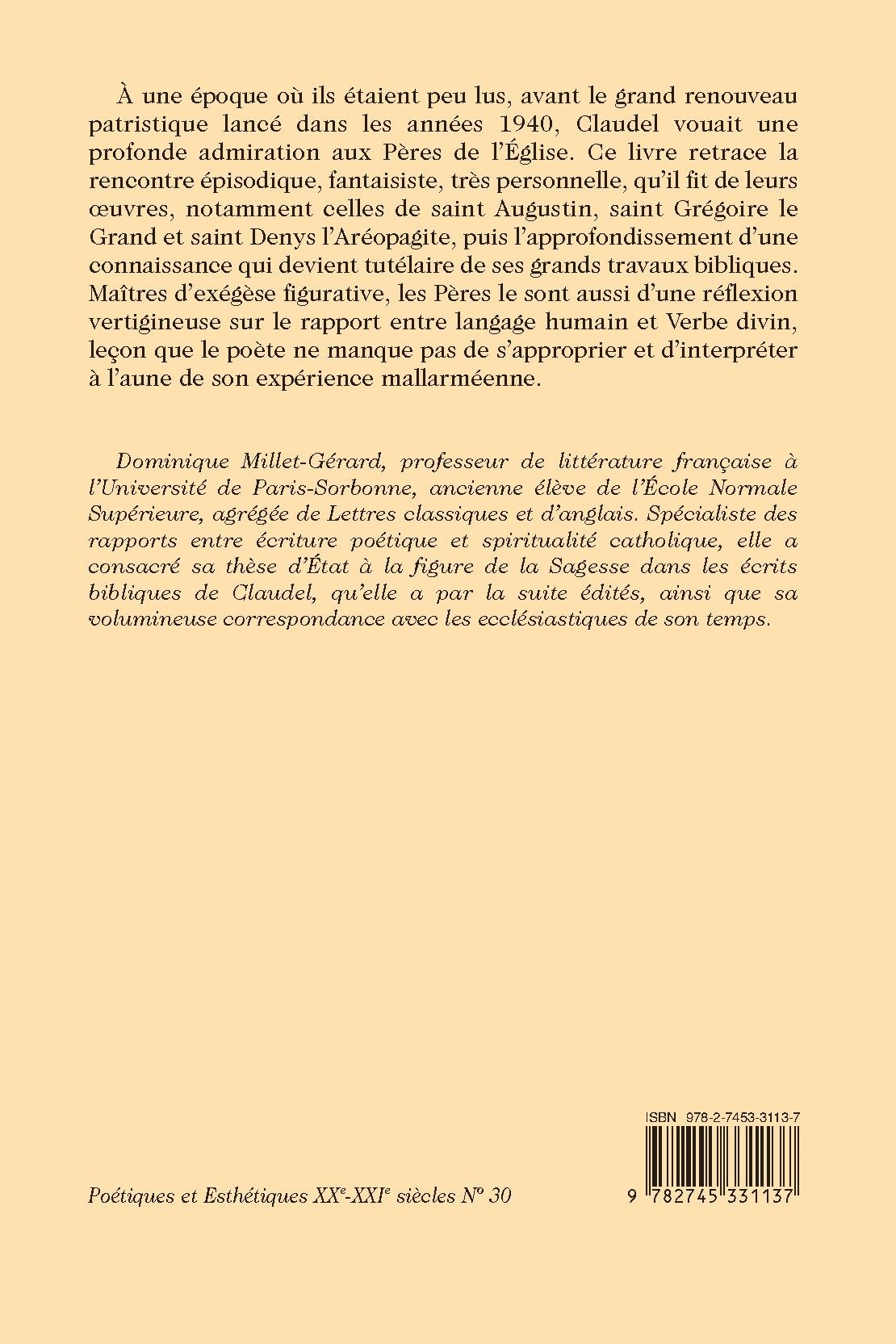 À une époque où ils étaient peu lus, avant le grand renouveau patristique lancé dans les années 1940, Claudel vouait une profonde admiration aux Pères de l’Église. Ce livre retrace la rencontre épisodique, fantaisiste, très personnelle, qu’il fit de leurs œuvres, notamment celles de saint Augustin, saint Grégoire le Grand et saint Denys l’Aréopagite, puis l’approfondissement d’une connaissance qui devient tutélaire de ses grands travaux bibliques. Maîtres d’exégèse figurative, les Pères le sont aussi d’une réflexion vertigineuse sur le rapport entre langage humain et Verbe divin, leçon que le poète ne manque pas de s’approprier et d’interpréter à l’aune de son expérience mallarméenne.