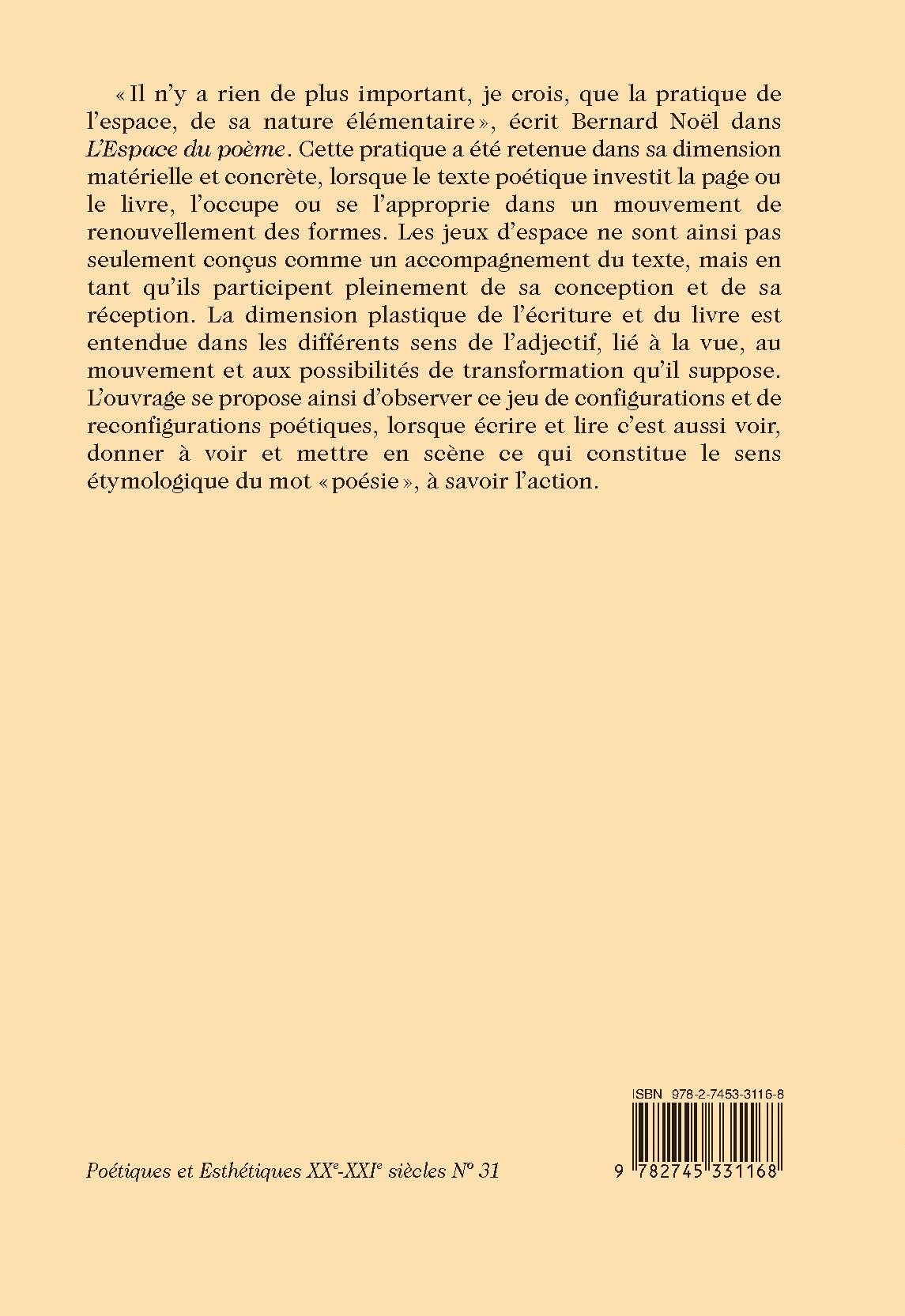 « Il n’y a rien de plus important, je crois, que la pratique de l’espace, de sa nature élémentaire », écrit Bernard Noël dans L’Espace du poème. Cette pratique a été retenue dans sa dimension matérielle et concrète, lorsque le texte poétique investit la page ou le livre, l’occupe ou se l’approprie dans un mouvement de renouvellement des formes. Les jeux d’espace ne sont ainsi pas seulement conçus comme un accompagnement du texte, mais en tant qu’ils participent pleinement de sa conception et de sa réception. La dimension plastique de l’écriture et du livre est entendue dans les différents sens de l’adjectif, lié à la vue, au mouvement et aux possibilités de transformation qu’il suppose. L’ouvrage se propose ainsi d’observer ce jeu de configurations et de reconfigurations poétiques, lorsque écrire et lire c’est aussi voir, donner à voir et mettre en scène ce qui constitue le sens étymologique du mot « poésie », à savoir l’action.