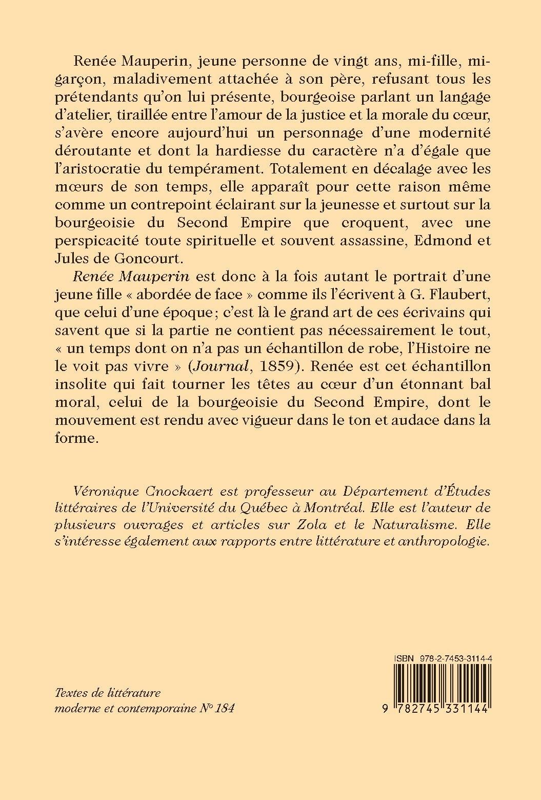 Renée Mauperin, jeune personne de vingt ans, mi-fille, migarçon, maladivement attachée à son père, refusant tous les prétendants qu’on lui présente, bourgeoise parlant un langage d’atelier, tiraillée entre l’amour de la justice et la morale du coeur, s’avère encore aujourd’hui un personnage d’une modernité déroutante et dont la hardiesse du caractère n’a d’égale que l’aristocratie du tempérament. Totalement en décalage avec les moeurs de son temps, elle apparaît pour cette raison même comme un contrepoint éclairant sur la jeunesse et surtout sur la bourgeoisie du Second Empire que croquent, avec une perspicacité toute spirituelle et souvent assassine, Edmond et Jules de Goncourt.