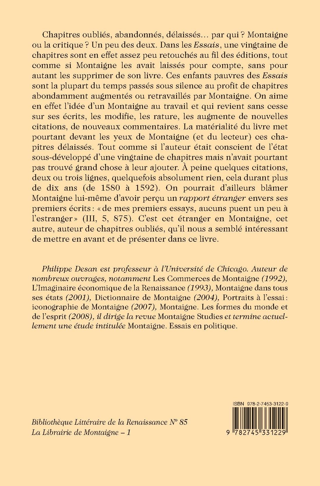 Chapitres oubliés, abandonnés, délaissés… par qui? Montaigne ou la critique ? Un peu des deux. Dans les Essais, une vingtaine de chapitres sont en effet assez peu retouchés au fil des éditions, tout comme si Montaigne les avait laissés pour compte, sans pour autant les supprimer de son livre. Ces enfants pauvres des Essais sont la plupart du temps passés sous silence au profit de chapitres abondamment augmentés ou retravaillés par Montaigne. On aime en effet l’idée d’un Montaigne au travail et qui revient sans cesse sur ses écrits, les modifie, les rature, les augmente de nouvelles citations, de nouveaux commentaires. La matérialité du livre met pourtant devant les yeux de Montaigne (et du lecteur) ces chapitres délaissés. Tout comme si l’auteur était conscient de l’état sous-développé d’une vingtaine de chapitres mais n’avait pourtant pas trouvé grand-chose à leur ajouter. À peine quelques citations, deux ou trois lignes, quelquefois absolument rien, cela durant plus de dix ans (de 1580 à 1592). On pourrait d’ailleurs blâmer Montaigne lui-même d’avoir perçu un rapport étranger envers ses premiers écrits : «de mes premiers essays, aucuns puent un peu à l’estranger » (III, 5, 875). C’est cet étranger en Montaigne, cet autre, auteur de chapitres oubliés, qu’il nous a semblé intéressant de mettre en avant et de présenter dans ce livre.