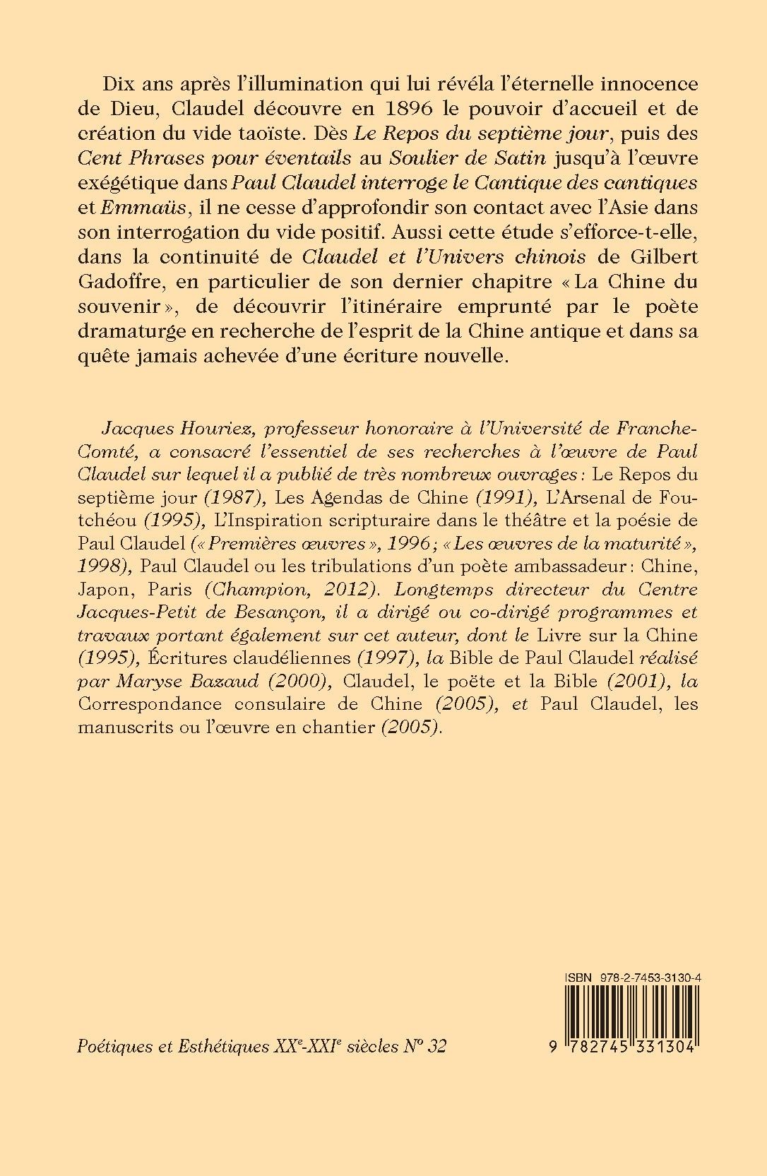Dix ans après l’illumination qui lui révéla l’éternelle innocence de Dieu, Claudel découvre en 1896 le pouvoir d’accueil et de création du vide taoïste. Dès Le Repos du septième jour, puis des Cent Phrases pour éventails au Soulier de Satin jusqu’à l’oeuvre exégétique dans Paul Claudel interroge le Cantique des cantiques et Emmaüs, il ne cesse d’approfondir son contact avec l’Asie dans son interrogation du vide positif. Aussi cette étude s’efforce-t-elle, dans la continuité de Claudel et l’Univers chinois de Gilbert Gadoffre, en particulier de son dernier chapitre «La Chine du souvenir », de découvrir l’itinéraire emprunté par le poète dramaturge en recherche de l’esprit de la Chine antique et dans sa quête jamais achevée d’une écriture nouvelle.