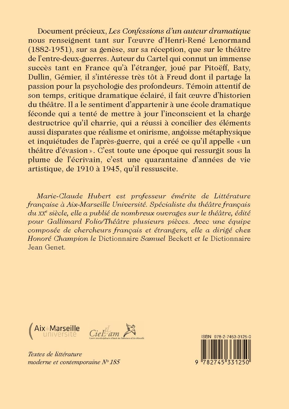 Document précieux, Les Confessions d’un auteur dramatique nous renseignent tant sur l’œuvre d’Henri-René Lenormand (1882-1951), sur sa genèse, sur sa réception, que sur le théâtre de l’entre-deux-guerres. Auteur du Cartel qui connut un immense succès tant en France qu’à l’étranger, joué par Pitoëff, Baty, Dullin, Gémier, il s’intéresse très tôt à Freud dont il partage la passion pour la psychologie des profondeurs. Témoin attentif de son temps, critique dramatique éclairé, il fait oeuvre d’historien du théâtre. Il a le sentiment d’appartenir à une école dramatique féconde qui a tenté de mettre à jour l’inconscient et la charge destructrice qu’il charrie, qui a réussi à concilier des éléments aussi disparates que réalisme et onirisme, angoisse métaphysique et inquiétudes de l’après-guerre, qui a créé ce qu’il appelle «un théâtre d’évasion ». C’est toute une époque qui ressurgit sous la plume de l’écrivain, c’est une quarantaine d’années de vie artistique, de 1910 à 1945, qu’il ressuscite.