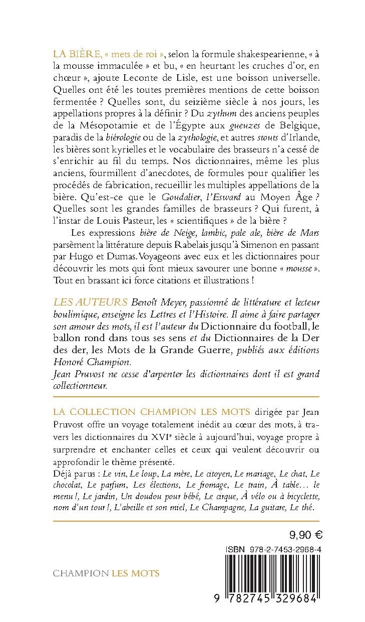 LA BIÈRE, « mets de roi », selon la formule shakespearienne, « à la mousse immaculée » et bu, « en heurtant les cruches d’or, en chœur », ajoute Leconte de Lisle, est une boisson universelle. Quelles ont été les toutes premières mentions de cette boisson fermentée ? Quelles sont, du seizième siècle à nos jours, les appellations propres à la définir ? Du zythum des anciens peuples de la Mésopotamie et de l’Égypte aux gueuzes de Belgique, paradis de la biérologie ou de la zythologie, et autres stouts d’Irlande, les bières sont kyrielles et le vocabulaire des brasseurs n’a cessé de s’enrichir au fil du temps. Nos dictionnaires, même les plus anciens, fourmillent d’anecdotes, de formules pour qualifier les procédés de fabrication, recueillir les multiples appellations de la bière. Qu’est-ce que le Goudalier, l’Esward au Moyen Âge ? Quelles sont les grandes familles de brasseurs ? Qui furent, à l’instar de Louis Pasteur, les « scientifiques » de la bière ? Les expressions bière de Neige, lambic, pale ale, bière de Mars parsèment la littérature depuis Rabelais jusqu’à Simenon en passant par Hugo et Dumas. Voyageons avec eux et les dictionnaires pour découvrir les mots qui font mieux savourer une bonne « mousse ». Tout en brassant ici force citations et illustrations !