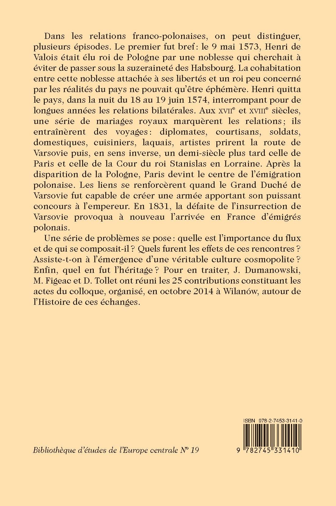 Dans les relations franco-polonaises, on peut distinguer, plusieurs épisodes. Le premier fut bref : le 9 mai 1573, Henri de Valois était élu roi de Pologne par une noblesse qui cherchait à éviter de passer sous la suzeraineté des Habsbourg. La cohabitation entre cette noblesse attachée à ses libertés et un roi peu concerné par les réalités du pays ne pouvait qu’être éphémère. Henri quitta le pays, dans la nuit du 18 au 19 juin 1574, interrompant pour de longues années les relations bilatérales. Aux XVIIe et XVIIIe siècles, une série de mariages royaux marquèrent les relations ; ils entraînèrent des voyages : diplomates, courtisans, soldats, domestiques, cuisiniers, laquais, artistes prirent la route de Varsovie puis, en sens inverse, un demi-siècle plus tard celle de Paris et celle de la Cour du roi Stanislas en Lorraine. Après la disparition de la Pologne, Paris devint le centre de l’émigration polonaise. Les liens se renforcèrent quand le Grand Duché de Varsovie fut capable de créer une armée apportant son puissant concours à l’empereur. En 1831, la défaite de l’insurrection de Varsovie provoqua à nouveau l’arrivée en France d’émigrés polonais.