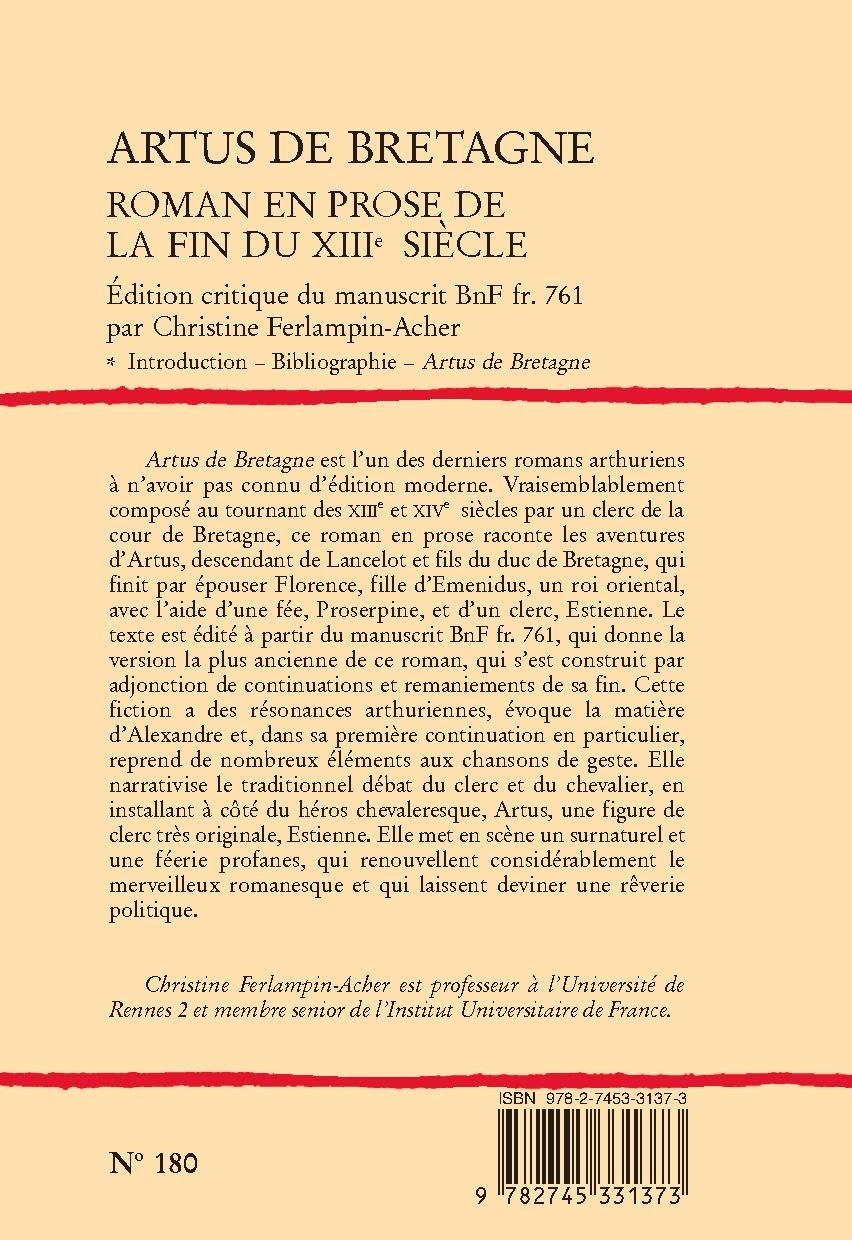 Artus de Bretagne est l’un des derniers romans arthuriens à n’avoir pas connu d’édition moderne. Vraisemblablement composé au tournant des XIIIe et XIVe siècles par un clerc de la cour de Bretagne, ce roman en prose raconte les aventures d’Artus, descendant de Lancelot et fils du duc de Bretagne, qui finit par épouser Florence, fille d’Emenidus, un roi oriental, avec l’aide d’une fée, Proserpine, et d’un clerc, Estienne. Le texte est édité à partir du manuscrit BnF fr. 761, qui donne la version la plus ancienne de ce roman, qui s’est construit par adjonction de continuations et remaniements de sa fin. Cette fiction a des résonances arthuriennes, évoque la matière d’Alexandre et, dans sa première continuation en particulier, reprend de nombreux éléments aux chansons de geste. Elle narrativise le traditionnel débat du clerc et du chevalier, en installant à côté du héros chevaleresque, Artus, une figure de clerc très originale, Estienne. Elle met en scène un surnaturel et une féerie profanes, qui renouvellent considérablement le merveilleux romanesque et qui laissent deviner une rêverie politique.