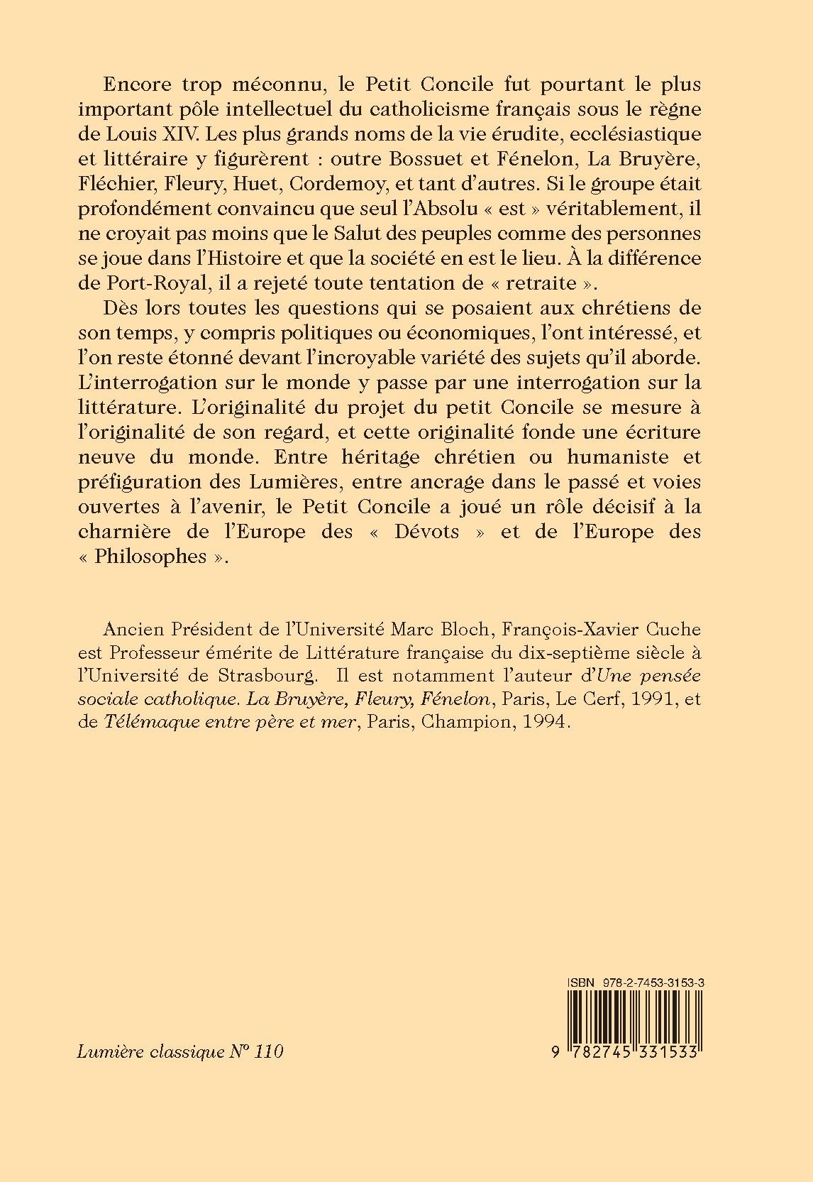 Encore trop méconnu, le Petit Concile fut pourtant le plus important pôle intellectuel du catholicisme français sous le règne de Louis XIV. Les plus grands noms de la vie érudite, ecclésiastique et littéraire y figurèrent : outre Bossuet et Fénelon, La Bruyère, Fléchier, Fleury, Huet, Cordemoy, et tant d’autres. Si le groupe était profondément convaincu que seul l’Absolu « est » véritablement, il ne croyait pas moins que le Salut des peuples comme des personnes se joue dans l’Histoire et que la société en est le lieu. À la différence de Port-Royal, il a rejeté toute tentation de « retraite ».
