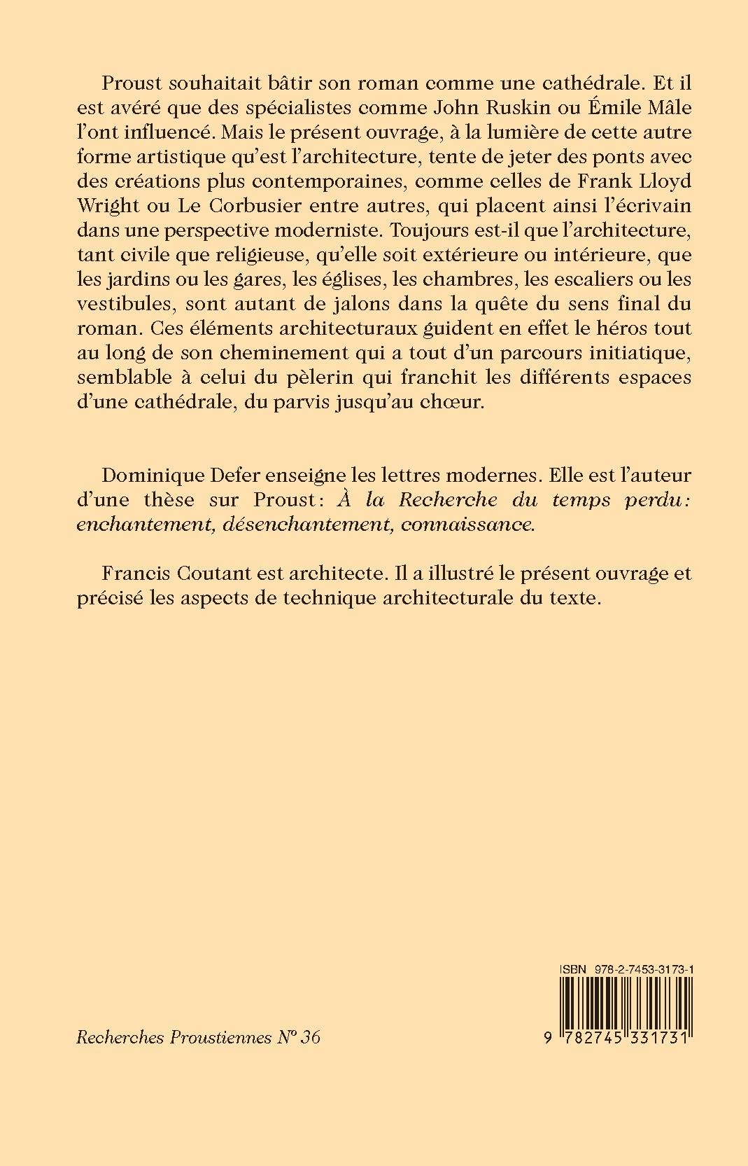 Proust souhaitait bâtir son roman comme une cathédrale. Et il est avéré que des spécialistes comme John Ruskin ou Émile Mâle l’ont influencé. Mais le présent ouvrage, à la lumière de cette autre forme artistique qu’est l’architecture, tente de jeter des ponts avec des créations plus contemporaines, comme celles de Frank Lloyd Wright ou Le Corbusier entre autres, qui placent ainsi l’écrivain dans une perspective moderniste. Toujours est-il que l’architecture, tant civile que religieuse, qu’elle soit extérieure ou intérieure, que les jardins ou les gares, les églises, les chambres, les escaliers ou les vestibules, sont autant de jalons dans la quête du sens final du roman. Ces éléments architecturaux guident en effet le héros tout au long de son cheminement qui a tout d’un parcours initiatique, semblable à celui du pèlerin qui franchit les différents espaces d’une cathédrale, du parvis jusqu’au chœur.