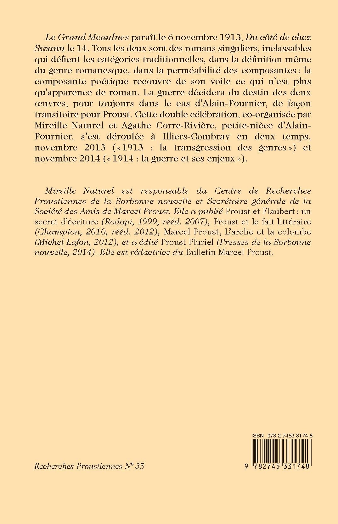 Le Grand Meaulnes paraît le 6 novembre 1913, Du côté de chez Swann le 14. Tous les deux sont des romans singuliers, inclassables qui défient les catégories traditionnelles, dans la définition même du genre romanesque, dans la perméabilité des composantes : la composante poétique recouvre de son voile ce qui n’est plus qu’apparence de roman. La guerre décidera du destin des deux œuvres, pour toujours dans le cas d’Alain-Fournier, de façon transitoire pour Proust. Cette double célébration, co-organisée par Mireille Naturel et Agathe Corre-Rivière, petite-nièce d’Alain- Fournier, s’est déroulée à Illiers-Combray en deux temps, novembre 2013 (« 1913 : la transgression des genres ») et novembre 2014 (« 1914 : la guerre et ses enjeux »).