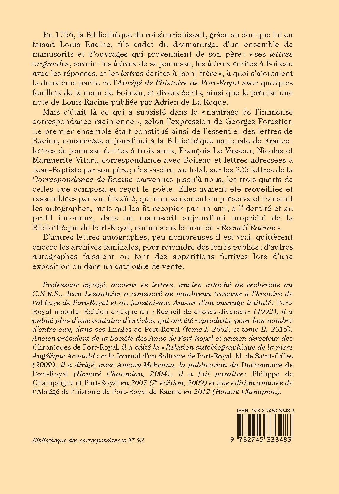 Mais c’était là ce qui a subsisté dans le « naufrage de l’immense correspondance racinienne », selon l’expression de Georges Forestier. Le premier ensemble était constitué ainsi de l’essentiel des lettres de Racine, conservées aujourd’hui à la Bibliothèque nationale de France : lettres de jeunesse écrites à trois amis, François Le Vasseur, Nicolas et Marguerite Vitart, correspondance avec Boileau et lettres adressées à Jean-Baptiste par son père ; c’est-à-dire, au total, sur les 225 lettres de la Correspondance de Racine parvenues jusqu’à nous, les trois quarts de celles que composa et reçut le poète. Elles avaient été recueillies et rassemblées par son fils aîné, qui non seulement en préserva et transmit les autographes, mais qui les fit recopier par un ami, à l’identité et au profil inconnus, dans un manuscrit aujourd’hui propriété de la Bibliothèque de Port-Royal, connu sous le nom de « Recueil Racine ».