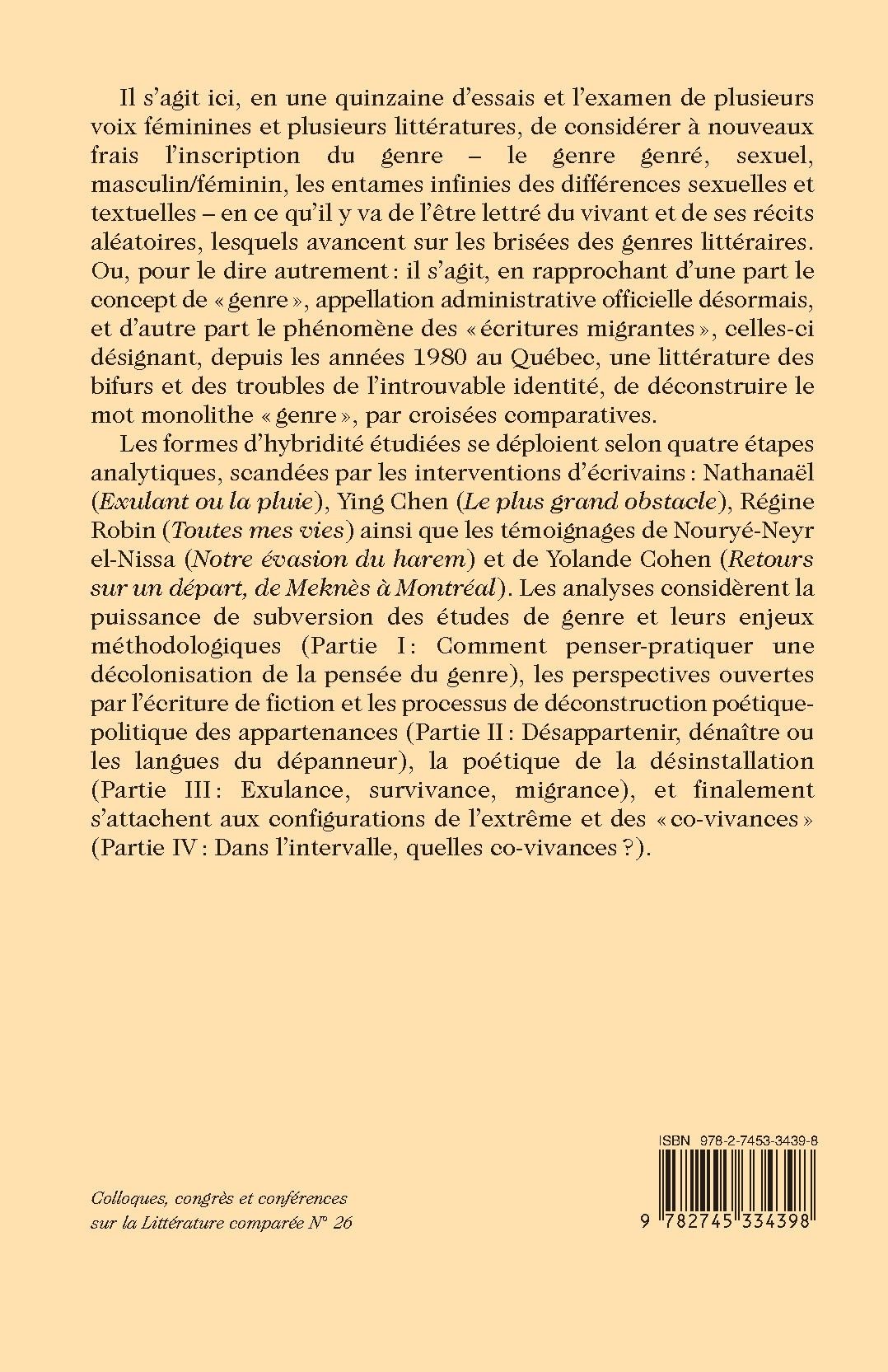 Il s’agit ici, en une quinzaine d’essais et l’examen de plusieurs voix féminines et plusieurs littératures, de considérer à nouveaux frais l’inscription du genre – le genre genré, sexuel, masculin/féminin, les entames infinies des différences sexuelles et textuelles – en ce qu’il y va de l’être lettré du vivant et de ses récits aléatoires, lesquels avancent sur les brisées des genres littéraires. Ou, pour le dire autrement : il s’agit, en rapprochant d’une part le concept de « genre », appellation administrative officielle désormais, et d’autre part le phénomène des « écritures migrantes », celles-ci désignant, depuis les années 1980 au Québec, une littérature des bifurs et des troubles de l’introuvable identité, de déconstruire le mot monolithe « genre », par croisées comparatives.