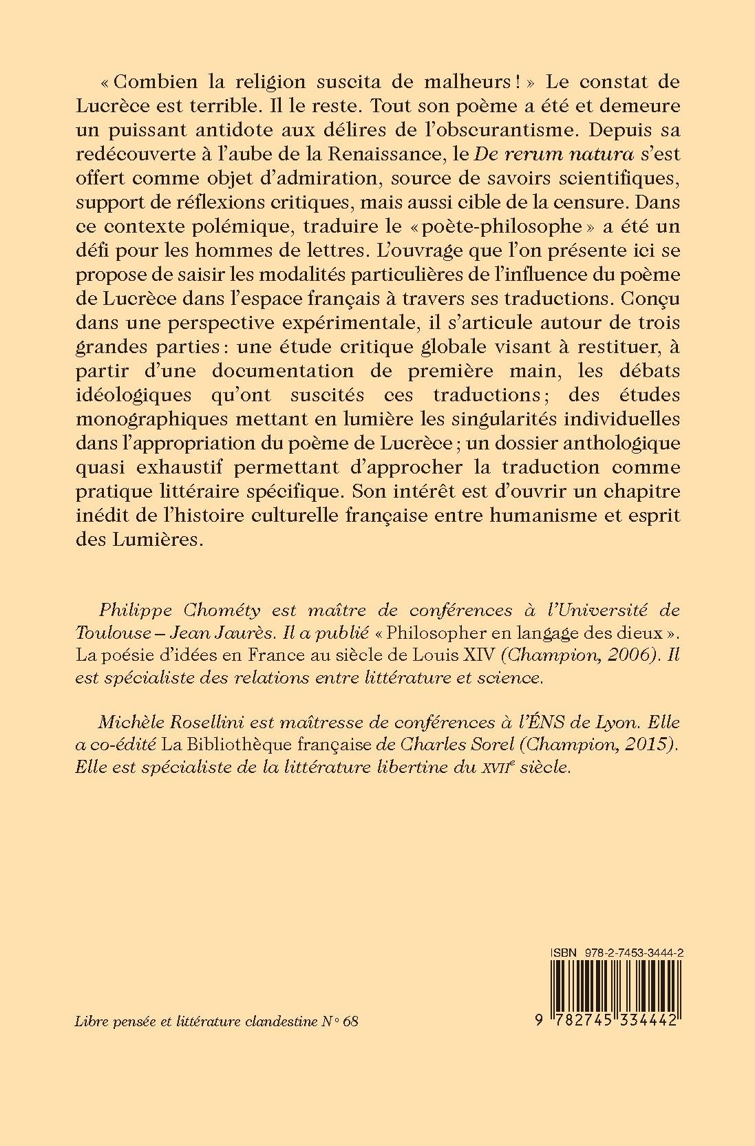 « Combien la religion suscita de malheurs ! » Le constat de Lucrèce est terrible. Il le reste. Tout son poème a été et demeure un puissant antidote aux délires de l’obscurantisme. Depuis sa redécouverte à l’aube de la Renaissance, le De rerum natura s’est offert comme objet d’admiration, source de savoirs scientifiques, support de réflexions critiques, mais aussi cible de la censure. Dans ce contexte polémique, traduire le « poète-philosophe » a été un défi pour les hommes de lettres. L’ouvrage que l’on présente ici se propose de saisir les modalités particulières de l’influence du poème de Lucrèce dans l’espace français à travers ses traductions. Conçu dans une perspective expérimentale, il s’articule autour de trois grandes parties : une étude critique globale visant à restituer, à partir d’une documentation de première main, les débats idéologiques qu’ont suscités ces traductions ; des études monographiques mettant en lumière les singularités individuelles dans l’appropriation du poème de Lucrèce ; un dossier anthologique quasi exhaustif permettant d’approcher la traduction comme pratique littéraire spécifique. Son intérêt est d’ouvrir un chapitre inédit de l’histoire culturelle française entre humanisme et esprit des Lumières.