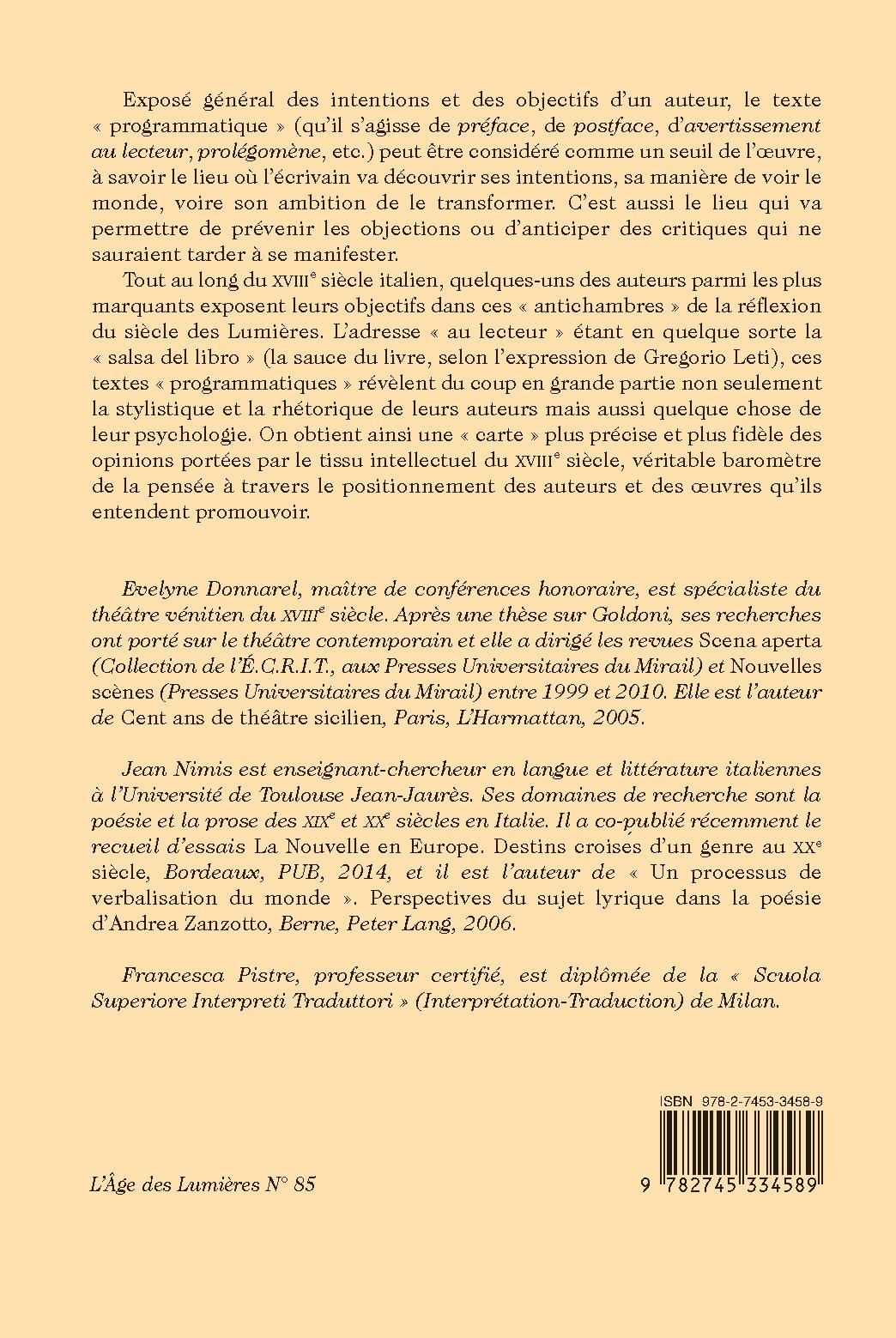 Exposé général des intentions et des objectifs d’un auteur, le texte « programmatique » (qu’il s’agisse de préface, de postface, d’avertissement au lecteur, prolégomène, etc.) peut être considéré comme un seuil de l’oeuvre, à savoir le lieu où l’écrivain va découvrir ses intentions, sa manière de voir le monde, voire son ambition de le transformer. C’est aussi le lieu qui va permettre de prévenir les objections ou d’anticiper des critiques qui ne sauraient tarder à se manifester. Tout au long du XVIIIe siècle italien, quelques-uns des auteurs parmi les plus marquants exposent leurs objectifs dans ces « antichambres » de la réflexion du siècle des Lumières. L’adresse « au lecteur » étant en quelque sorte la « salsa del libro » (la sauce du livre, selon l’expression de Gregorio Leti), ces textes « programmatiques » révèlent du coup en grande partie non seulement la stylistique et la rhétorique de leurs auteurs mais aussi quelque chose de leur psychologie. On obtient ainsi une « carte » plus précise et plus fidèle des opinions portées par le tissu intellectuel du XVIIIe siècle, véritable baromètre de la pensée à travers le positionnement des auteurs et des œuvres qu’ils entendent promouvoir.