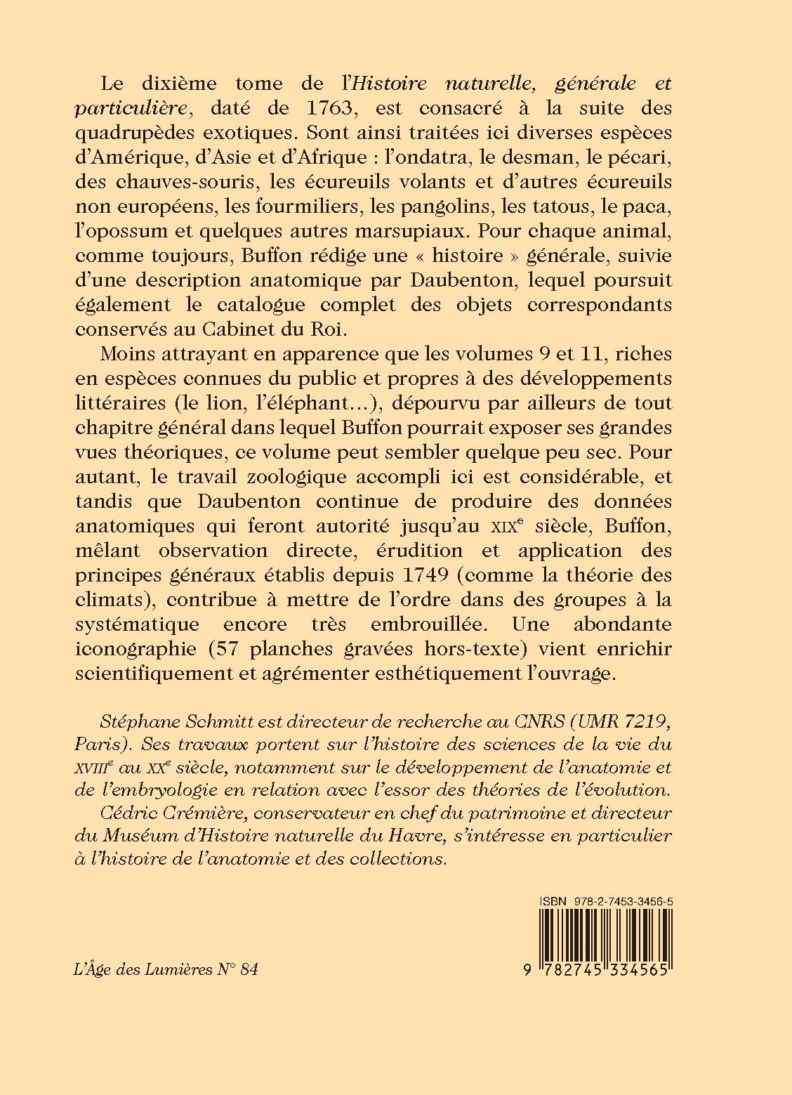 Le dixième tome de l’Histoire naturelle, générale et particulière, daté de 1763, est consacré à la suite des quadrupèdes exotiques. Sont ainsi traitées ici diverses espèces d’Amérique, d’Asie et d’Afrique : l’ondatra, le desman, le pécari, des chauves-souris, les écureuils volants et d’autres écureuils non européens, les fourmiliers, les pangolins, les tatous, le paca, l’opossum et quelques autres marsupiaux. Pour chaque animal, comme toujours, Buffon rédige une « histoire » générale, suivie d’une description anatomique par Daubenton, lequel poursuit également le catalogue complet des objets correspondants conservés au Cabinet du Roi.