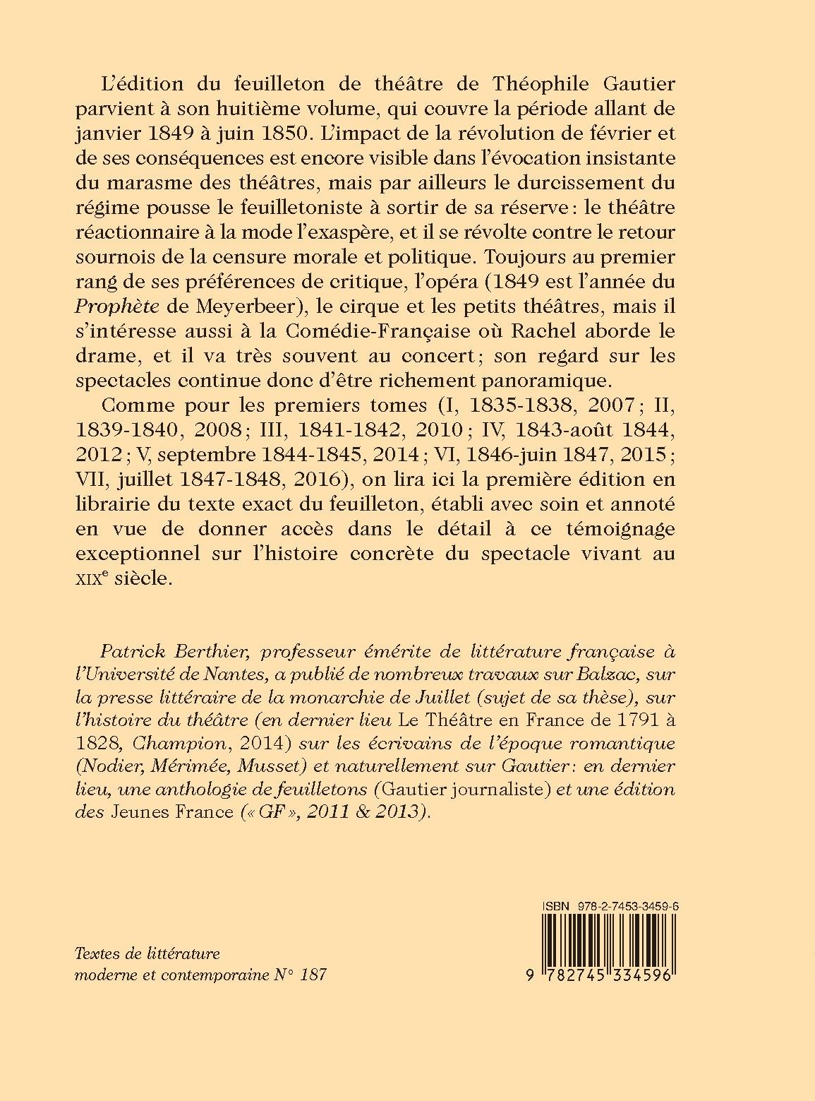 L’édition du feuilleton de théâtre de Théophile Gautier parvient à son huitième volume, qui couvre la période allant de janvier 1849 à juin 1850. L’impact de la révolution de février et de ses conséquences est encore visible dans l’évocation insistante du marasme des théâtres, mais par ailleurs le durcissement du régime pousse le feuilletoniste à sortir de sa réserve : le théâtre réactionnaire à la mode l’exaspère, et il se révolte contre le retour sournois de la censure morale et politique. Toujours au premier rang de ses préférences de critique, l’opéra (1849 est l’année du Prophète de Meyerbeer), le cirque et les petits théâtres, mais il s’intéresse aussi à la Comédie-Française où Rachel aborde le drame, et il va très souvent au concert ; son regard sur les spectacles continue donc d’être richement panoramique.