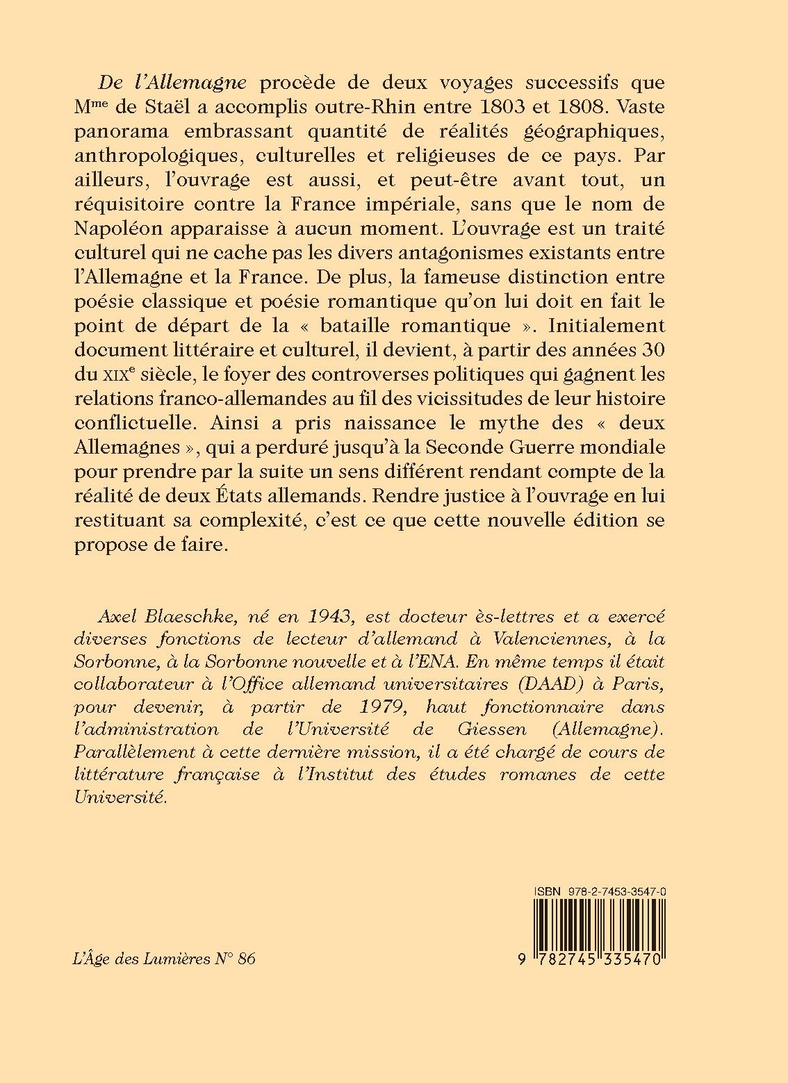 De l’Allemagne procède de deux voyages successifs que Mme de Staël a accomplis outre-Rhin entre 1803 et 1808. Vaste panorama embrassant quantité de réalités géographiques, anthropologiques, culturelles et religieuses de ce pays. Par ailleurs, l’ouvrage est aussi, et peut-être avant tout, un réquisitoire contre la France impériale, sans que le nom de Napoléon apparaisse à aucun moment. L’ouvrage est un traité culturel qui ne cache pas les divers antagonismes existants entre l’Allemagne et la France. De plus, la fameuse distinction entre poésie classique et poésie romantique qu’on lui doit en fait le point de départ de la « bataille romantique ». Initialement document littéraire et culturel, il devient, à partir des années 30 du XIXe siècle, le foyer des controverses politiques qui gagnent les relations franco-allemandes au fil des vicissitudes de leur histoire conflictuelle. Ainsi a pris naissance le mythe des « deux Allemagnes », qui a perduré jusqu’à la Seconde Guerre mondiale pour prendre par la suite un sens différent rendant compte de la réalité de deux États allemands. Rendre justice à l’ouvrage en lui restituant sa complexité, c’est ce que cette nouvelle édition se propose de faire.