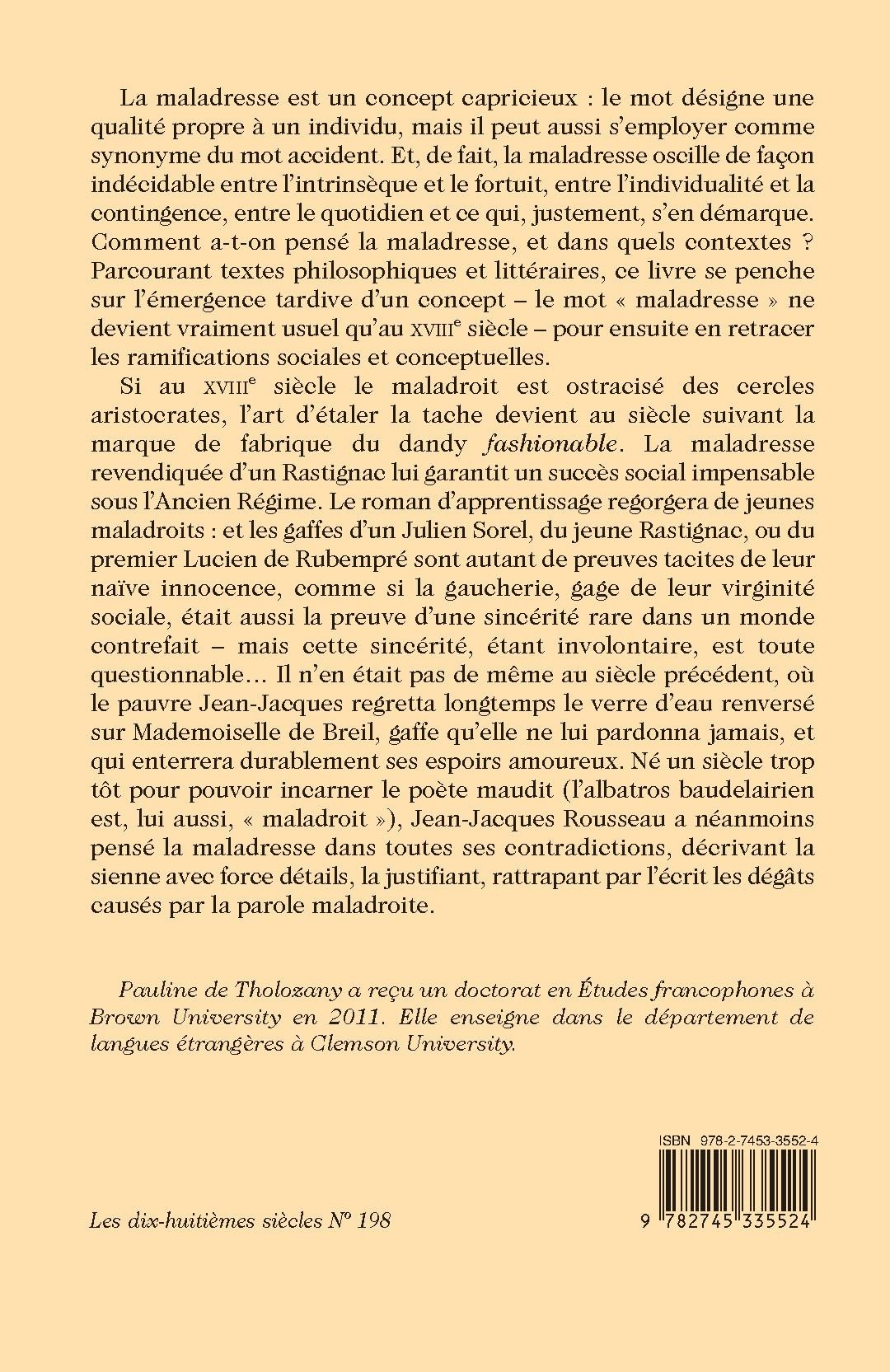 La maladresse est un concept capricieux : le mot désigne une qualité propre à un individu, mais il peut aussi s’employer comme synonyme du mot accident. Et, de fait, la maladresse oscille de façon indécidable entre l’intrinsèque et le fortuit, entre l’individualité et la contingence, entre le quotidien et ce qui, justement, s’en démarque. Comment a-t-on pensé la maladresse, et dans quels contextes ? Parcourant textes philosophiques et littéraires, ce livre se penche sur l’émergence tardive d’un concept – le mot « maladresse » ne devient vraiment usuel qu’au XVIIIe siècle – pour ensuite en retracer les ramifications sociales et conceptuelles.