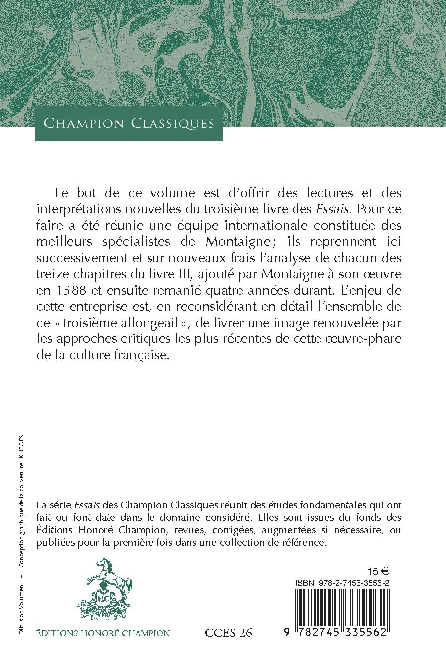 Le but de ce volume est d’offrir des lectures et des interprétations nouvelles du troisième livre des Essais. Pour ce faire a été réunie une équipe internationale constituée des meilleurs spécialistes de Montaigne ; ils reprennent ici successivement et sur nouveaux frais l’analyse de chacun des treize chapitres du livre III, ajouté par Montaigne à son oeuvre en 1588 et ensuite remanié quatre années durant. L’enjeu de cette entreprise est, en reconsidérant en détail l’ensemble de ce « troisième allongeail », de livrer une image renouvelée par les approches critiques les plus récentes de cette oeuvre-phare de la culture française.