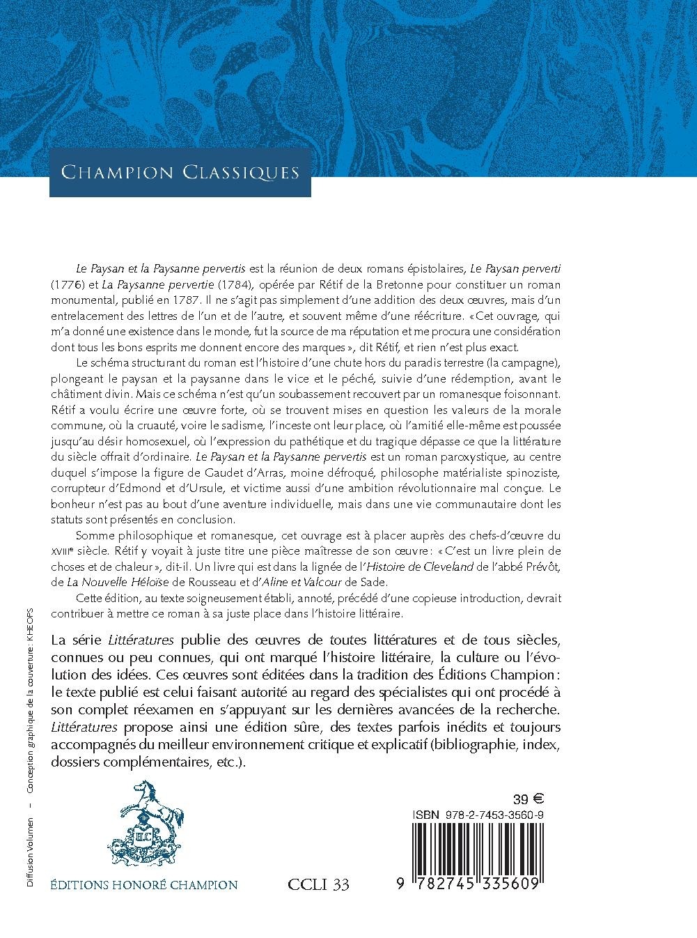 Le Paysan et la Paysanne pervertis est la réunion de deux romans épistolaires, Le Paysan perverti (1776) et La Paysanne pervertie (1784), opérée par Rétif de la Bretonne pour constituer un roman monumental, publié en 1787. Il ne s’agit pas simplement d’une addition des deux œuvres, mais d’un entrelacement des lettres de l’un et de l’autre, et souvent même d’une réécriture. « Cet ouvrage, qui m’a donné une existence dans le monde, fut la source de ma réputation et me procura une considération dont tous les bons esprits me donnent encore des marques », dit Rétif, et rien n’est plus exact. Le schéma structurant du roman est l’histoire d’une chute hors du paradis terrestre (la campagne), plongeant le paysan et la paysanne dans le vice et le péché, suivie d’une rédemption, avant le châtiment divin. Mais ce schéma n’est qu’un soubassement recouvert par un romanesque foisonnant. Rétif a voulu écrire une oeuvre forte, où se trouvent mises en question les valeurs de la morale commune, où la cruauté, voire le sadisme, l’inceste ont leur place, où l’amitié elle-même est poussée jusqu’au désir homosexuel, où l’expression du pathétique et du tragique dépasse ce que la littérature du siècle offrait d’ordinaire. Le Paysan et la Paysanne pervertis est un roman paroxystique, au centre duquel s’impose la figure de Gaudet d’Arras, moine défroqué, philosophe matérialiste spinoziste, corrupteur d’Edmond et d’Ursule, et victime aussi d’une ambition révolutionnaire mal conçue. Le bonheur n’est pas au bout d’une aventure individuelle, mais dans une vie communautaire dont les statuts sont présentés en conclusion. Somme philosophique et romanesque, cet ouvrage est à placer auprès des chefs-d'œuvre du XVIIIe siècle. Rétif y voyait à juste titre une pièce maîtresse de son oeuvre : «C’est un livre plein de choses et de chaleur», dit-il. Un livre qui est dans la lignée de l’Histoire de Cleveland de l’abbé Prévôt, de La Nouvelle Héloïse de Rousseau et d’Aline et Valcour de Sade. Cette édition, au texte soigneusement établi, annoté, précédé d’une copieuse introduction, devrait contribuer à mettre ce roman à sa juste place dans l’histoire littéraire.